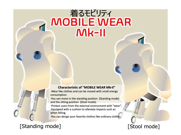 なぜ:現代の過剰な車社会は大きな便益をもたらす一方で、社会的費用を払わずに使用できるため、環境破壊や資源浪費、コミュニケーションの希薄化など様々な弊害を発生させている。それらの弊害を解決する方策のひとつとしてパーソナルモビリティに着目した。都市部では交通空白領域(ラストワンマイル)の補完や混雑解消・環境保全の手段として、地方では衰退した公共交通の代替や交通弱者の移動手段としての活用が期待される。セグウェイや電動キックボードなど従来の小型パーソナルモビリティの多くは立ち乗りであるが、レジャーやスポーツ用ではなく移動手段として使用するならばユーザの負担軽減が必要となる。 MOBILE WEAR Mk-IIはStanding modeで立ち乗り移動の軽快性を、Stool modeで座り姿勢移動の安楽性を提供する。また、多くのパーソナルモビリティは車室がなくユーザーは外部環境に晒されるが、MOBILE WEAR Mk-IIは「WEAR」がミニマムなキャビン機能を果たし、外部環境からユーザーを護る。さらに、通常の衣服と同様に「WEAR」を各個人が好みの外観意匠にすることで、パーソナルモビリティ使用に対する心理的バリア(「弱者に見られそう」)も低減できる。
