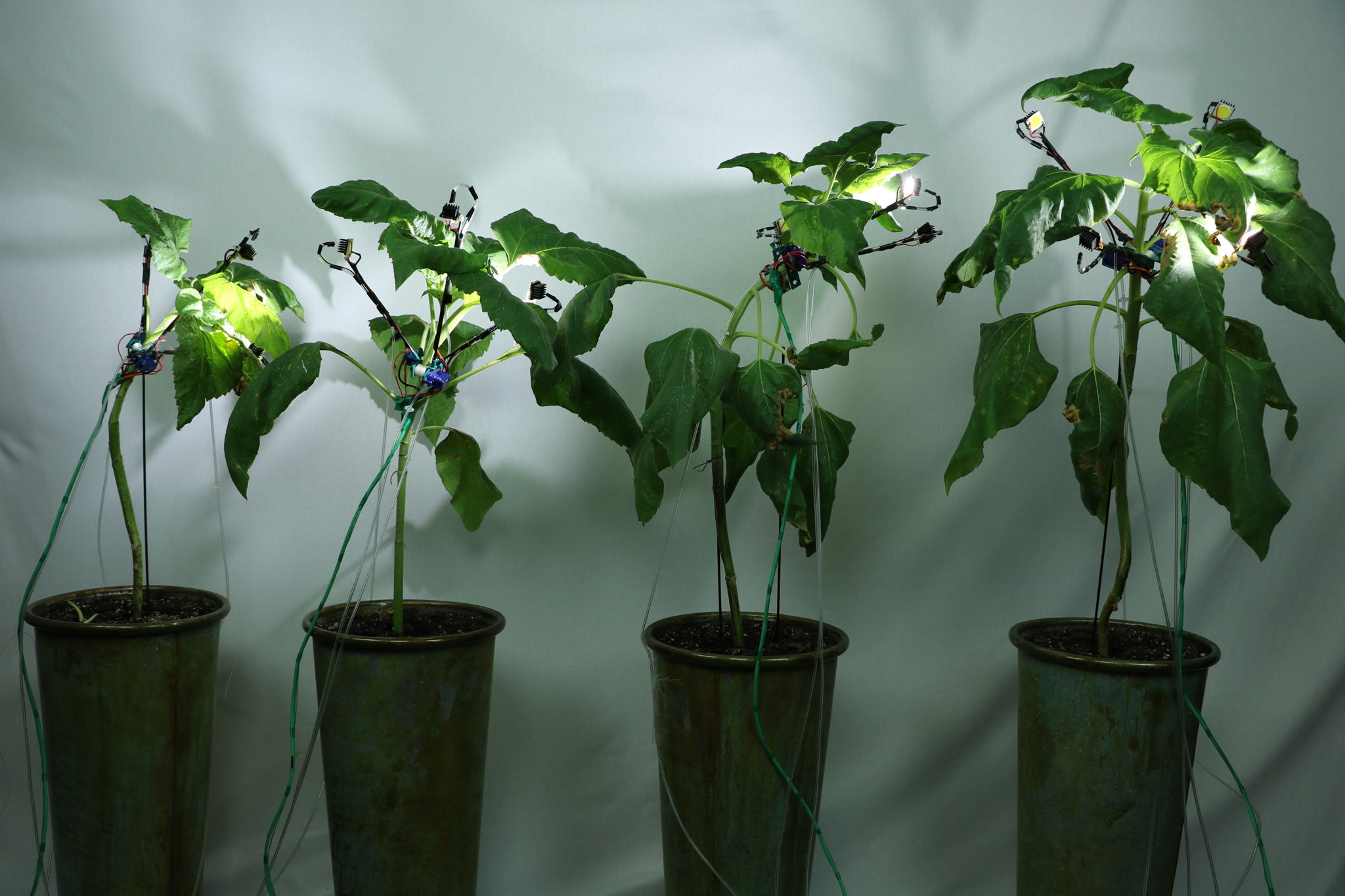 The whole setup entails a sunflower plant (Russian Mammoth variety, 6ft in tall pots 12” dia), our custom robots mounted on the plants and electric power (4A) controlling the lights. The above setup is easy to replicate in an exhibition system.