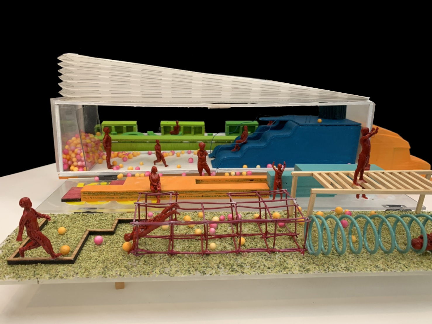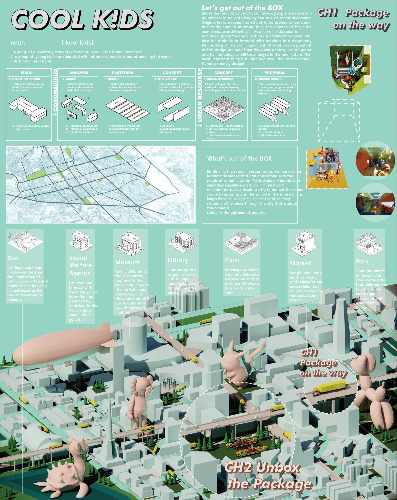 Rethink the school in urban scale, we found some learning resources that can correspond with the needs of school lecture. For instance, students can enjoy their scientific exploration in museum or in neighboring park. As a result, we try to project the school space to urban space. The school in the future will no longer fix in a building for 6-8 hours. On the contrary, students will explore through the city that embody the concept: