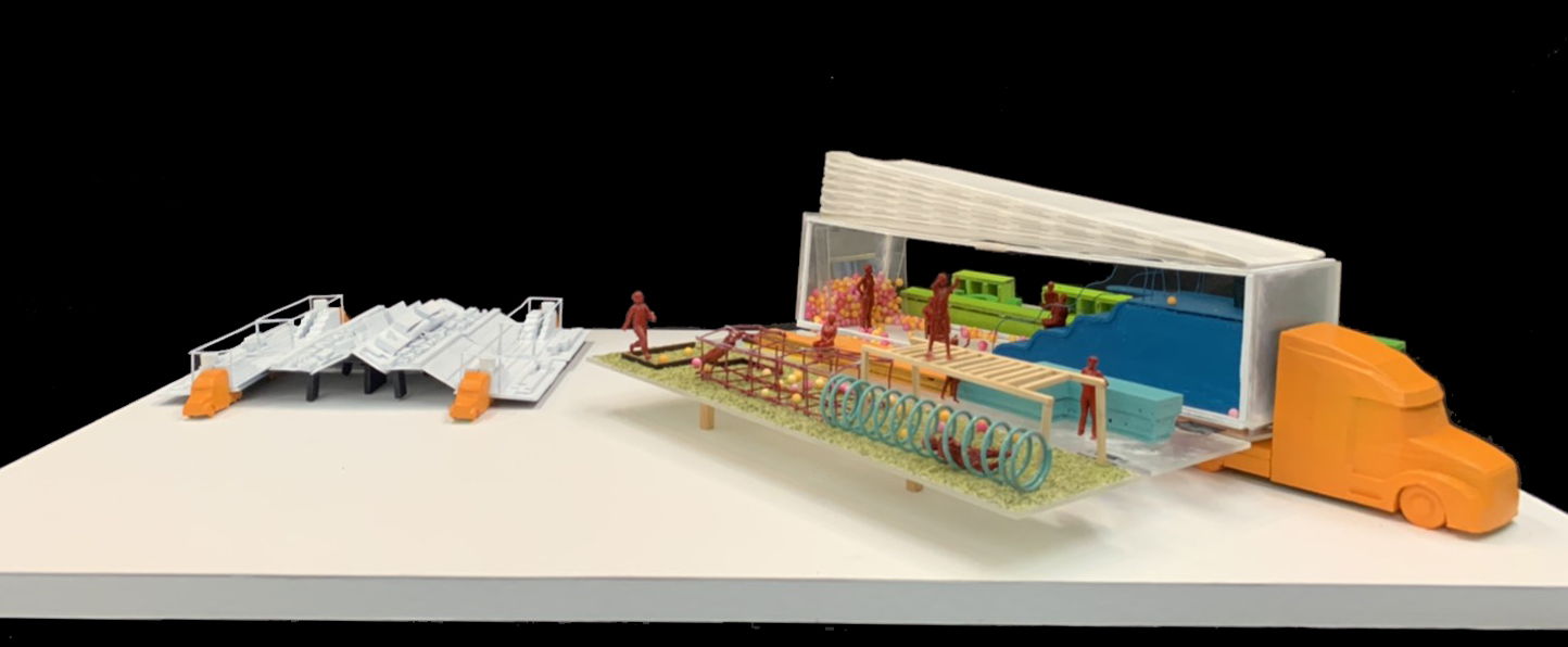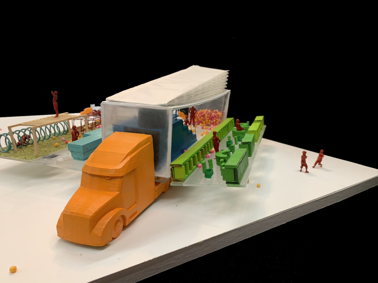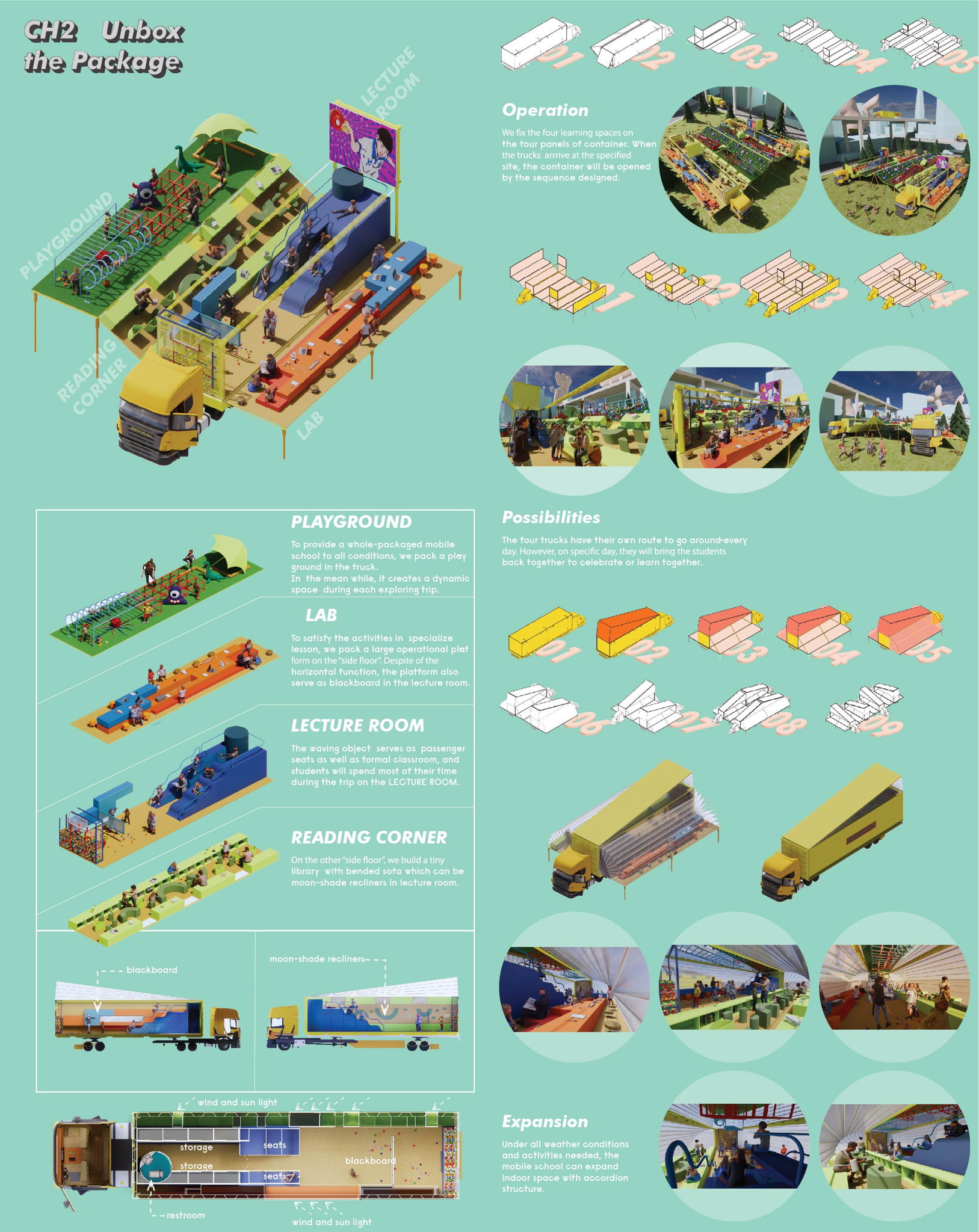 The classroom is transformed for the container which is the most efficient material resources. One unit size is 11.8m long, 2.13m wide and 2.72m high. The container is transported by the truck. Four containers combine together when the whole school students and teachers gather.