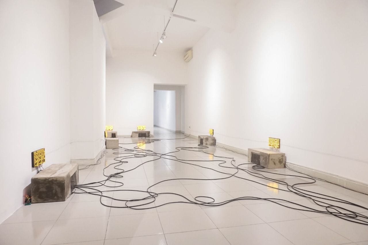 This work was made with an effort to minimize electric power so that it was executed by utilizing water waves. This work is my attempt to give the impression that the great thing does not have to be seen by looking up and then I move the sky down. Another context is built through the technique used, we use a pump instead of a dynamo so that this work looks more dynamic and visually and environmentally friendly. -