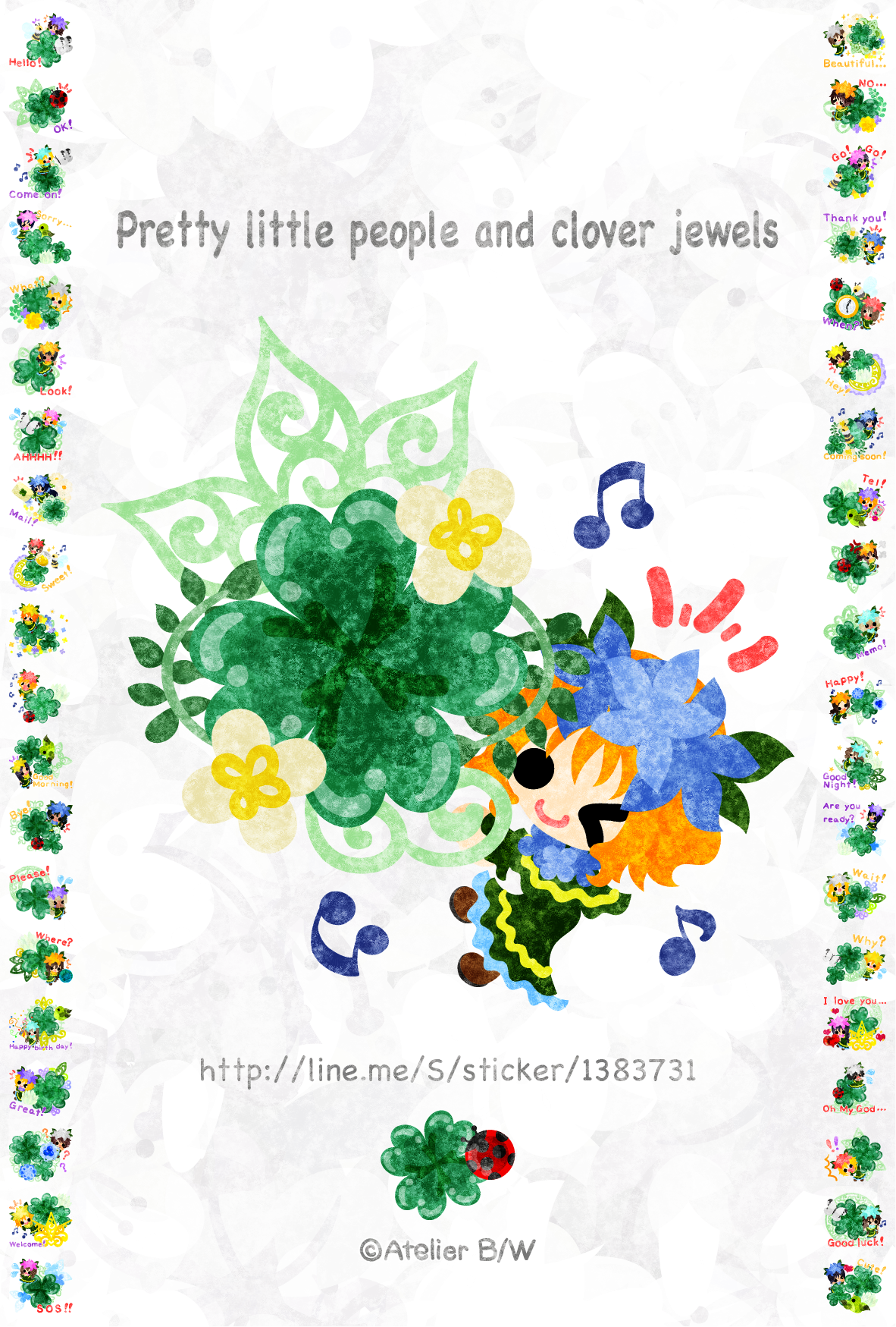 小さくて可愛い小人たちとクローバーの宝石のLINEスタンプ(英名:Pretty little people and clover jewels)を2/23に販売開始しました。日常会話を簡単な英語で表現しておりますので、外国の方にも使えます。