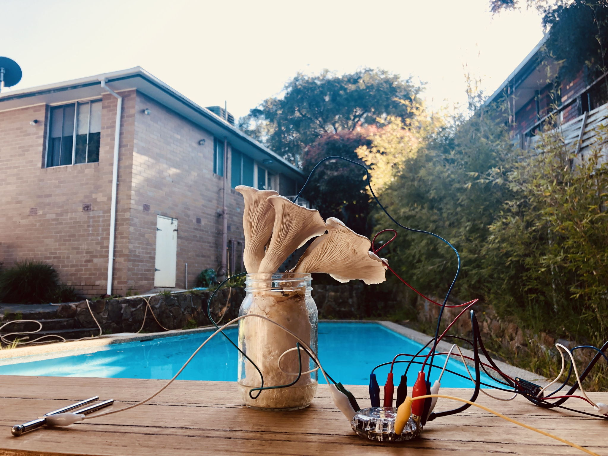 Adafruit Circuit Playground board with sensors for ambient temperature, light, sound. It is connected to an ADS1115 board with crocodile clips to gather electrical signals from living objects to turn into MIDI signals. Midi signals are then processed through MAXmsp computer program, outputted to various synthesisers on Logic Pro X digital audio workstation.