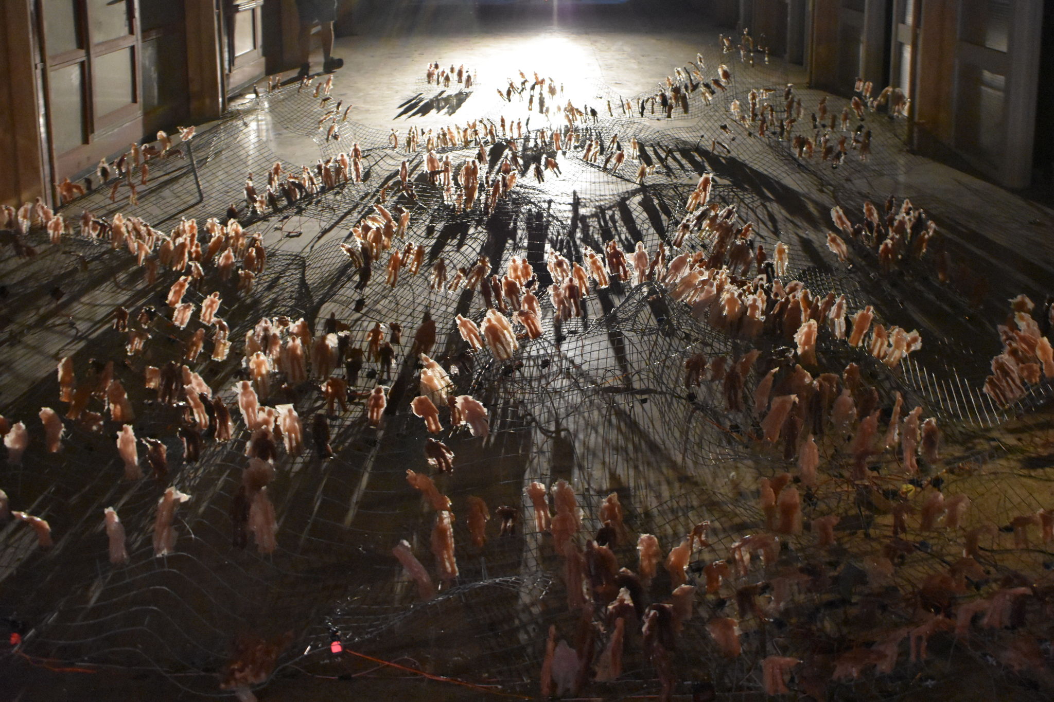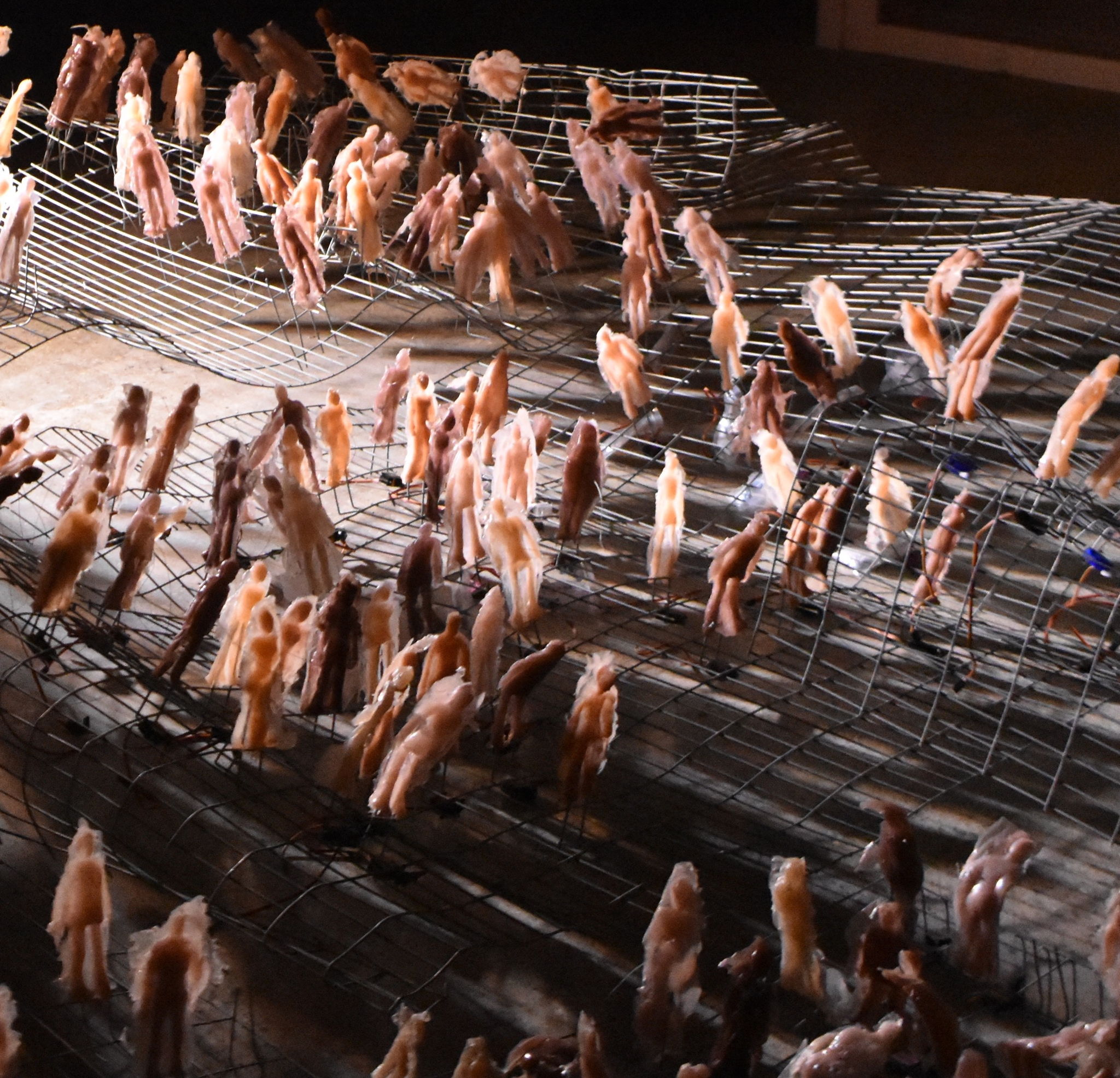 It is made from 500+ silicone figures, which I sculpted moulded and cast. Each one is connected to motors and a physical computer which is coded to create a synchronized motion. I used an Arduino computer and coded the motion of the motors to represent the motion of today's society. When one bows, the closest one to them bows and then so on in a ripple effect. What they are paying homage to is deliberately left unclear. The humanlike silicone creates a creepy, mischievous depiction of society and our human frailties. As individuals, we decode the reactions of others to decipher how we should act and the severity of situations. They exist on an undulating gridded steel form, 3m x 4m wide, standing at a regimented distance apart, representing how the world exists today. -