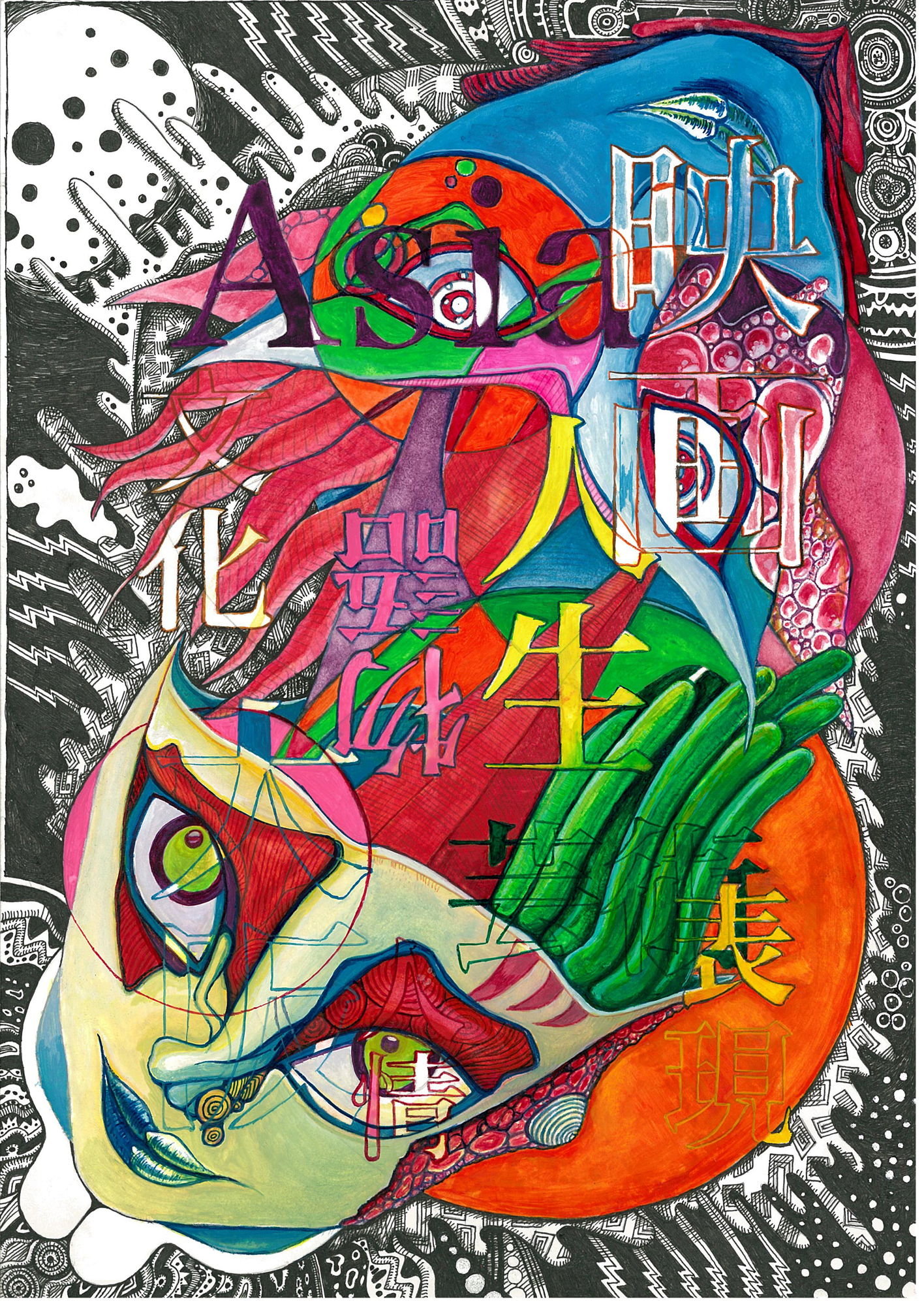 「大阪」「映画」「Asia」などの単語から派生し「人生」や「人情」「物語」なども共に文字モチーフに含めて描きました。