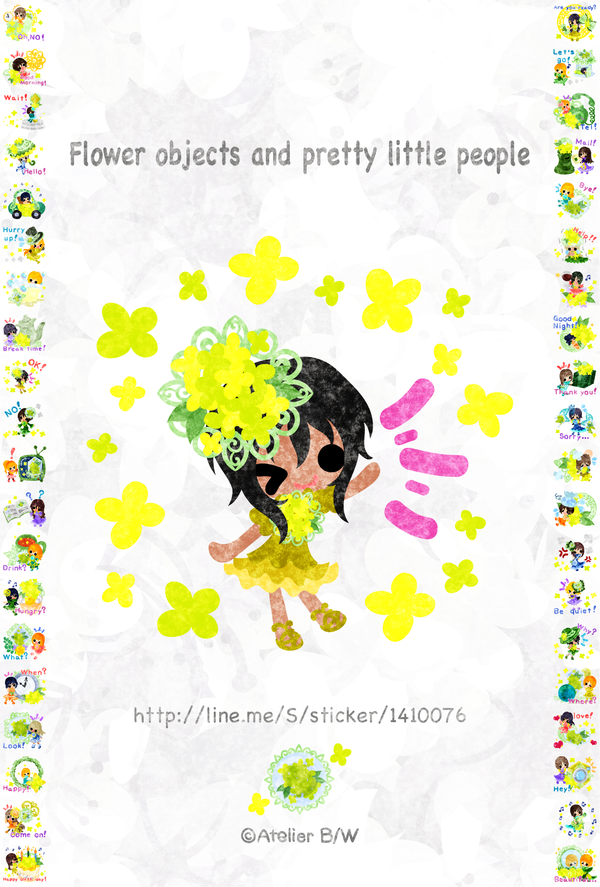 小さくて可愛い小人達と花の雑貨のLINEスタンプ(英名:Flower objects and pretty little people)を4/3に販売開始しました。日常会話を簡単な英語で表現しておりますので、外国の方にも使えます。