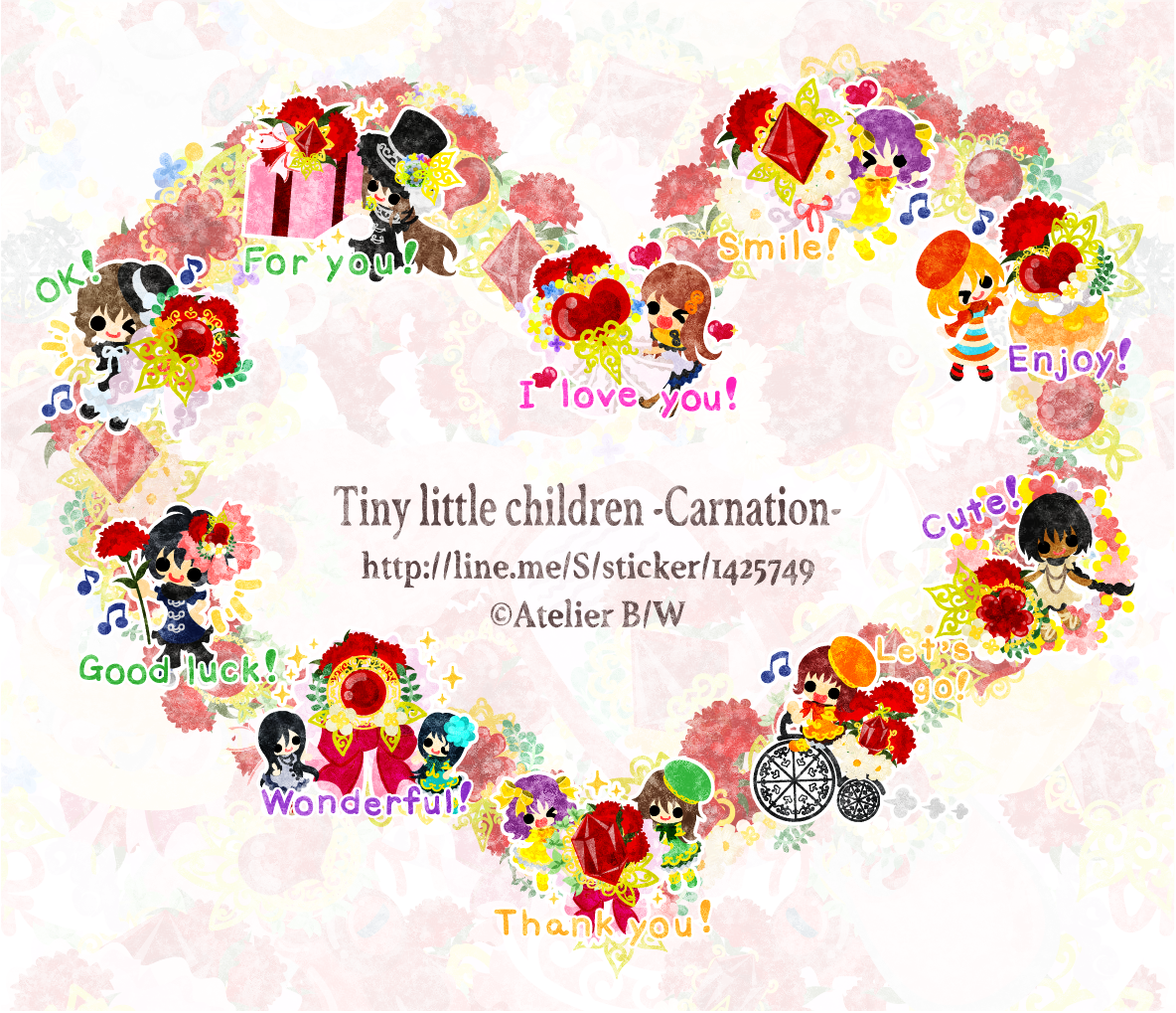 カーネーションをテーマにした小さくて可愛い子供達のLINEスタンプを5/1に販売開始しました。日常会話を簡単な英語で表現しておりますので、外国の方にも使えます。