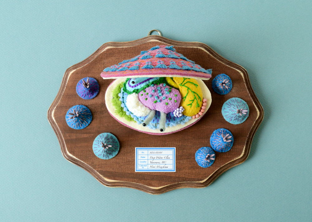 ソフトスカルプチュア系グループ展「Stitched 2」用の作品3点の内のひとつ「桃五目貝の解剖模型」(幅23cm)。