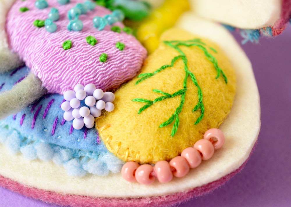 ソフトスカルプチュア系グループ展「Stitched 2」用の作品3点の内のひとつ「桃五目貝の解剖模型」(幅23cm)。