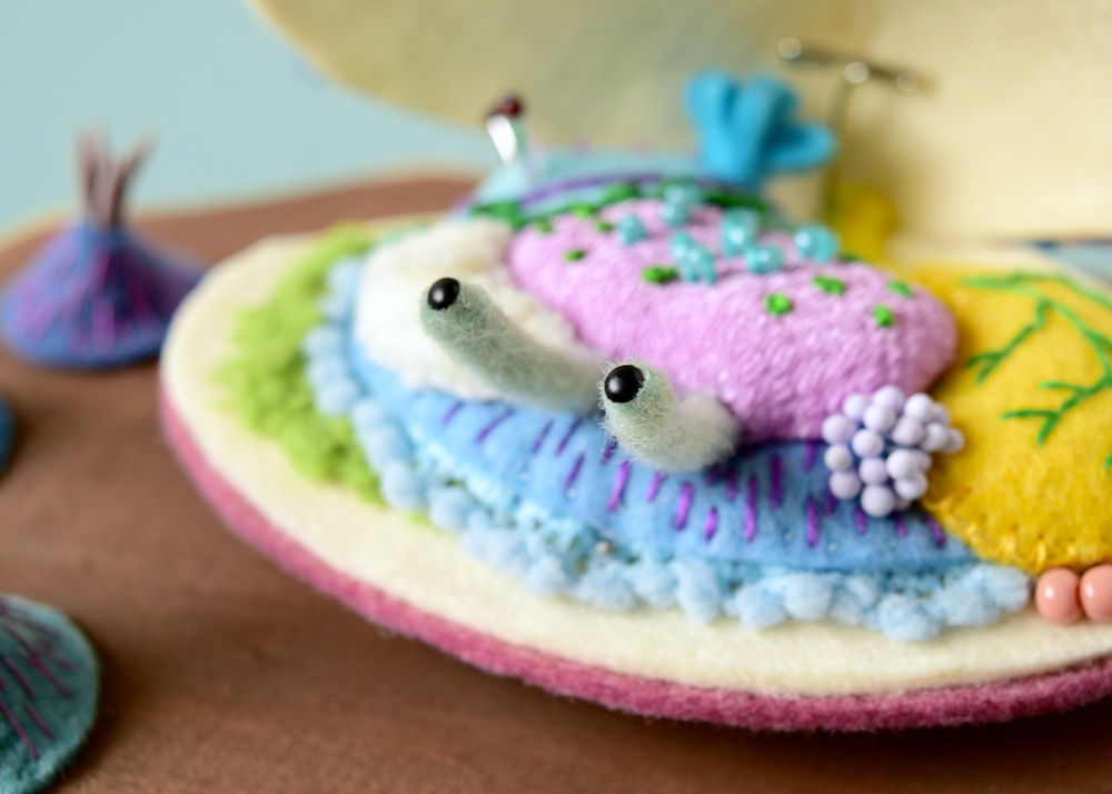 ソフトスカルプチュア系グループ展「Stitched 2」用の作品3点の内のひとつ「桃五目貝の解剖模型」(幅23cm)。