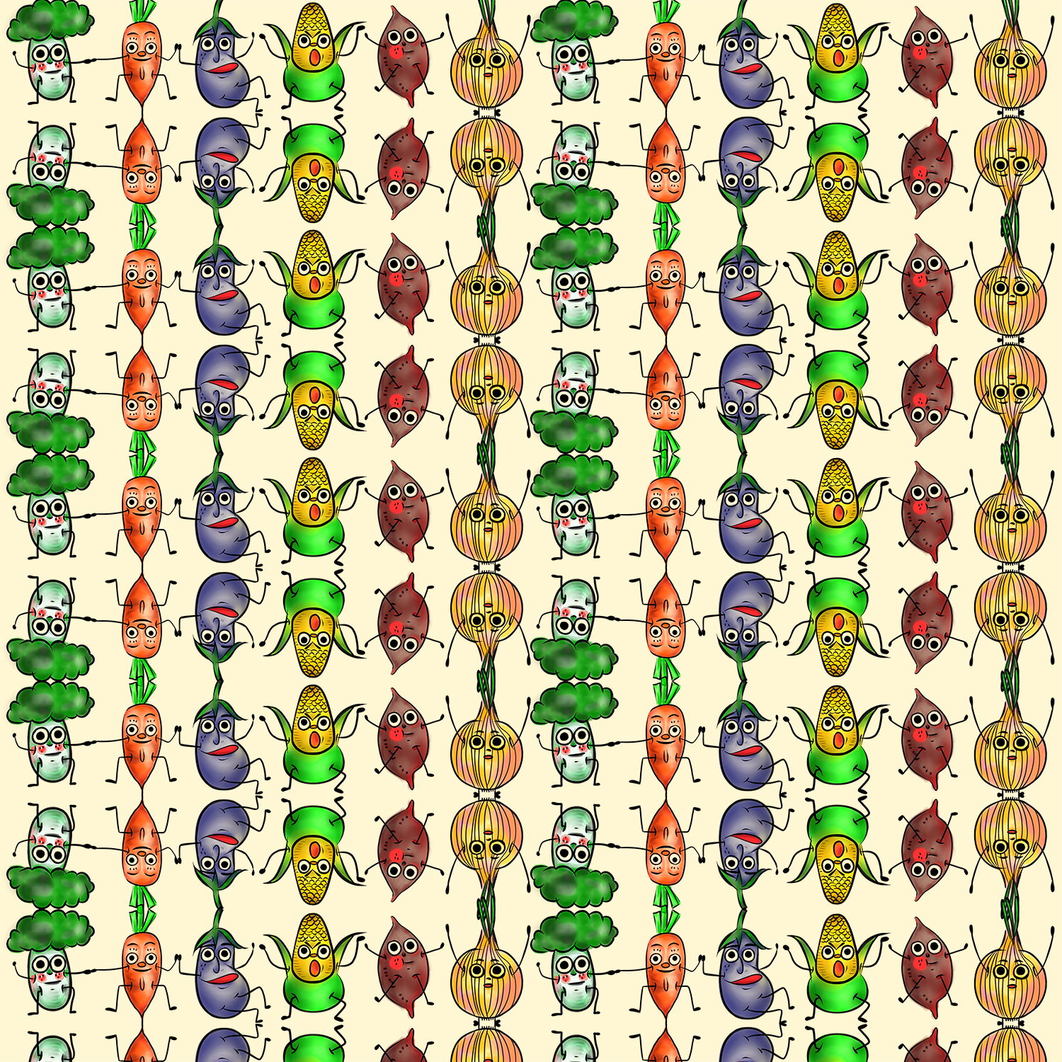 現代社會很多小朋友不愛吃蔬菜,因此想到這個創作靈感,如果這個插畫,設計在便當外的包巾,相信孩子們也不會抗拒他們的!