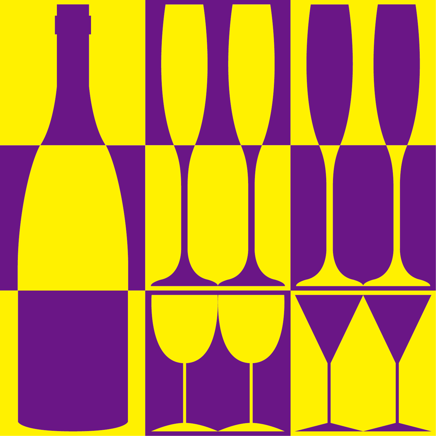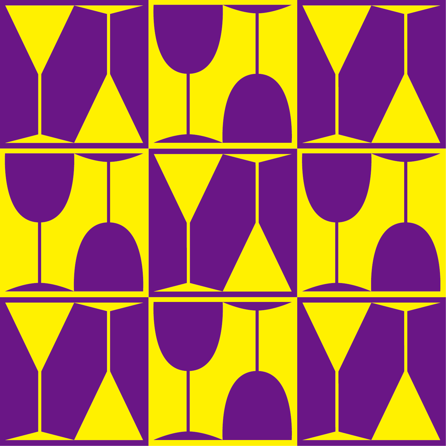 用黃紫互補色做搭配,以九宮格來區分色塊,再加上用兩種不同酒杯圖案,適合用來包裝酒瓶,也很適合在舉辦喝酒的聚會時做裝飾。