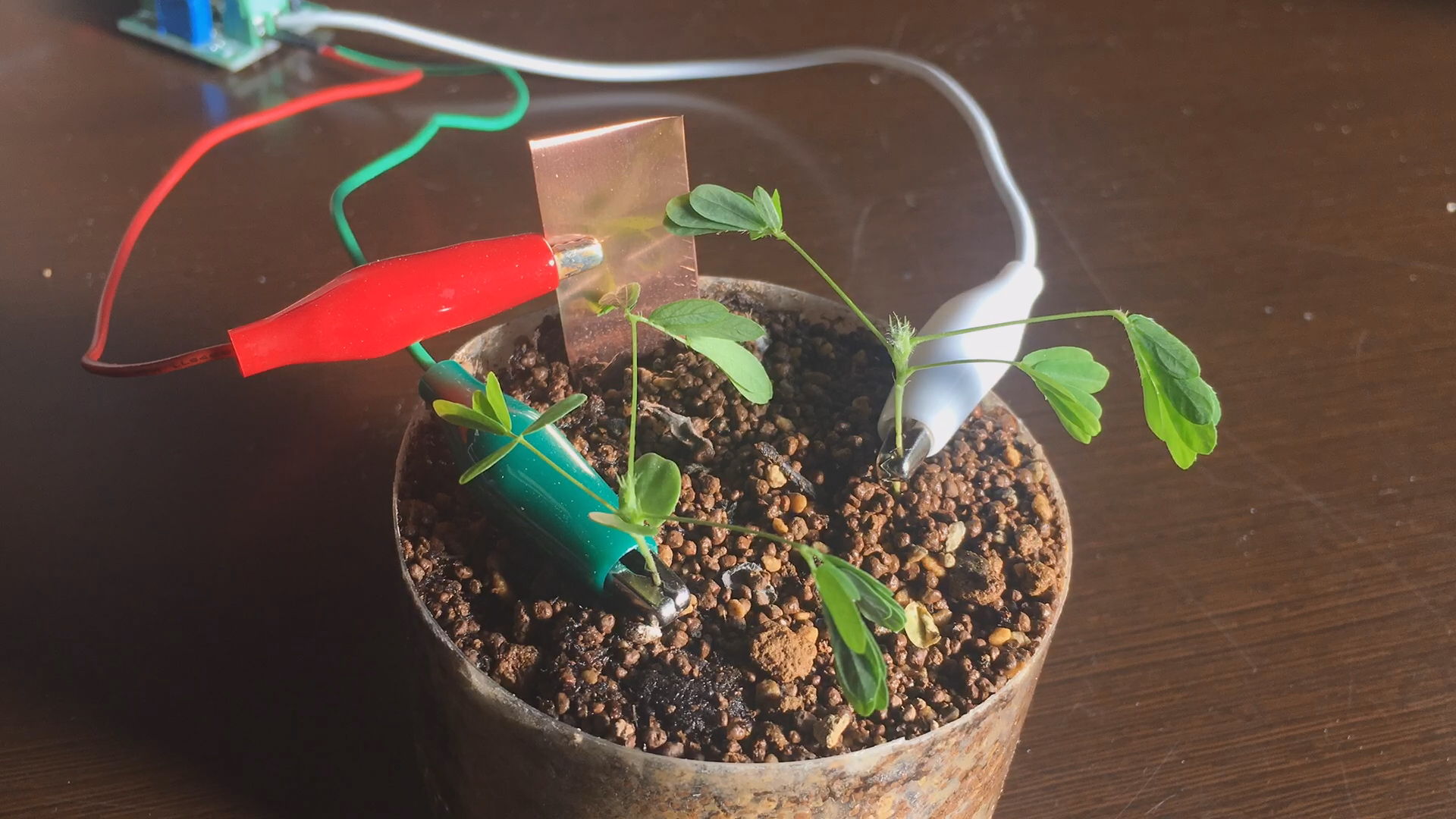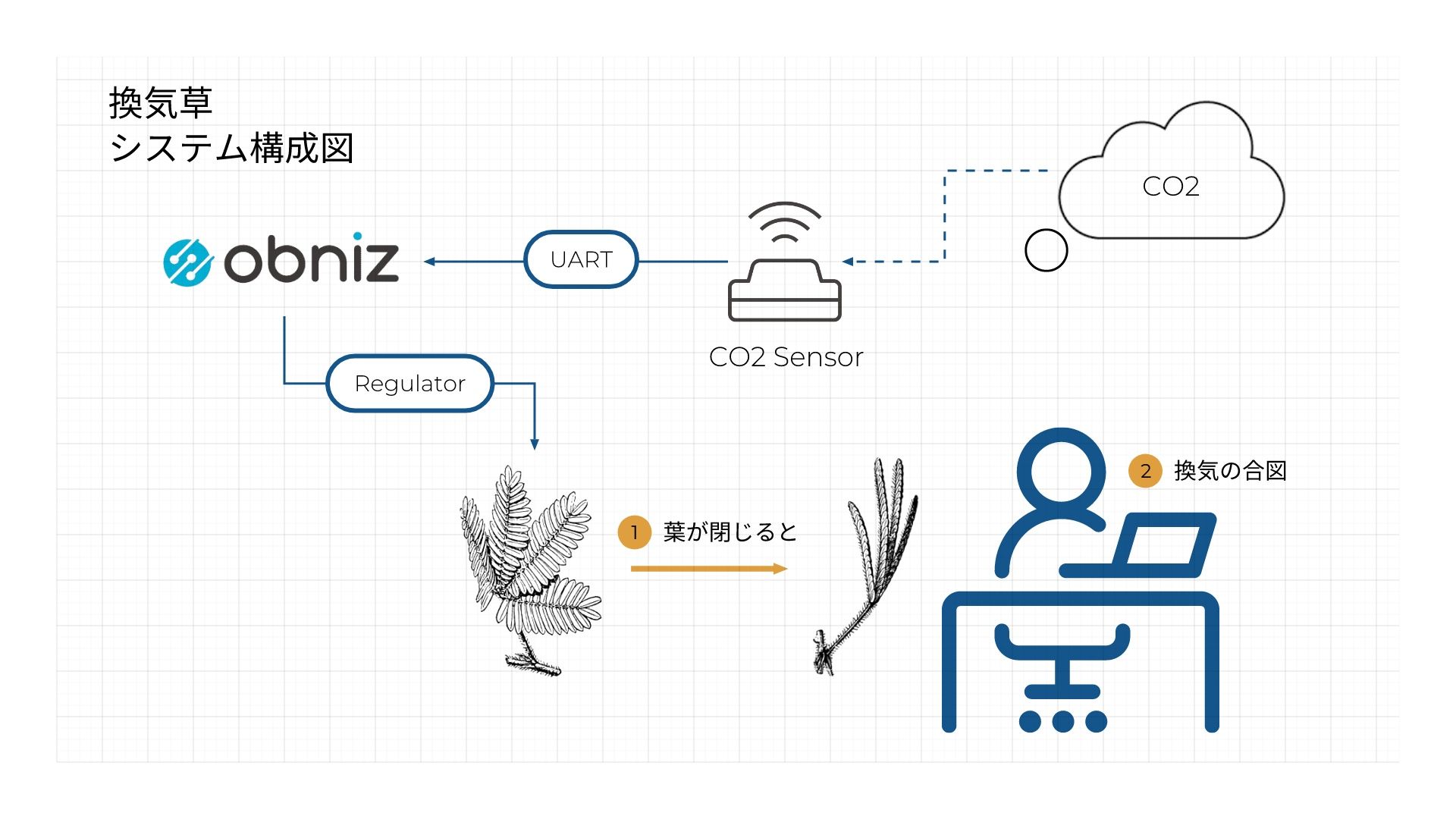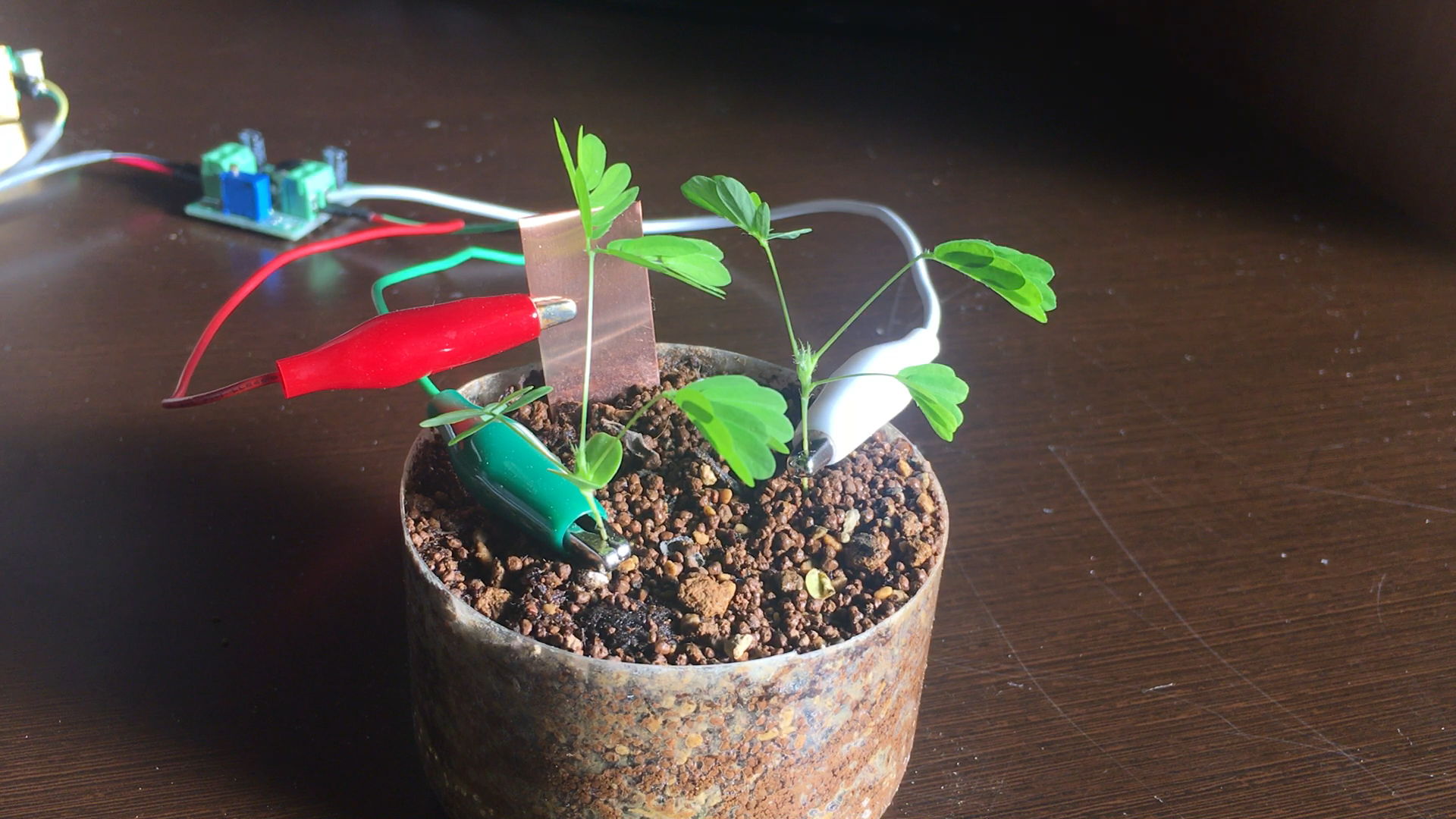 オジギソウの習性を利用し, 室内が息苦しくなったり作業の効率が低下したりしそうなタイミングで, 葉が閉じてそれとなく換気を促してくれる植木鉢です。