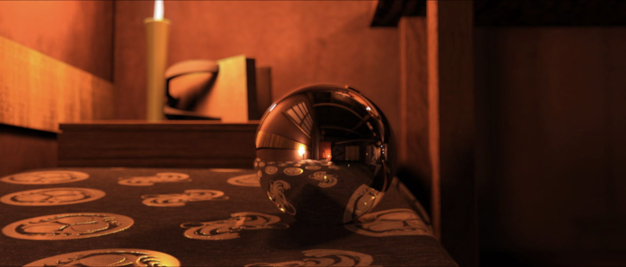 見ていて面白いギミックを使った映像が作りたいと思い、和室と和のモチーフを用いたピタゴラ装置を作成し、転がっていく球体越しに背景を映すことで部屋全体の雰囲気を見せることを試みました。