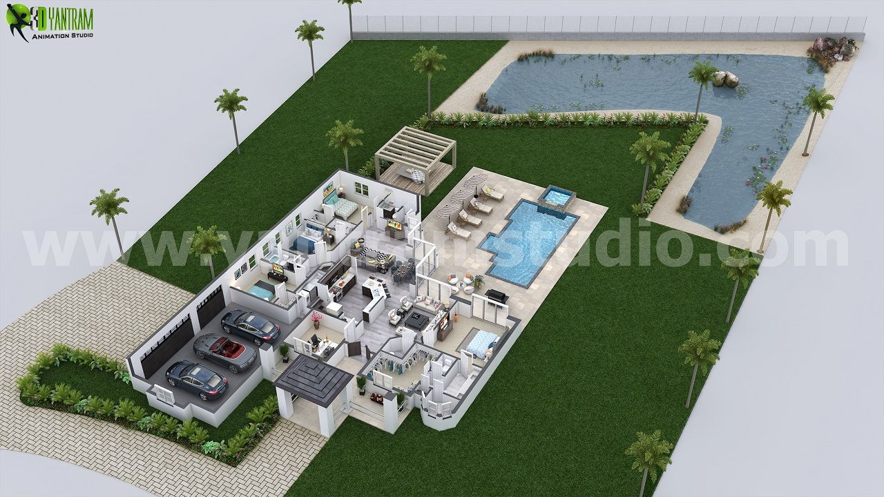 3D Floor plan with surrounding area of grass and pond to present your house more attractively. Modern furniture with perfect color combination makes house more beautiful. Floor plan contains 4 bedroom, living area, kitchen area, closet area, bathroom, swimming pool, patio, outdoor furniture, 3 car garage, office / dan with surrounding site and pond.