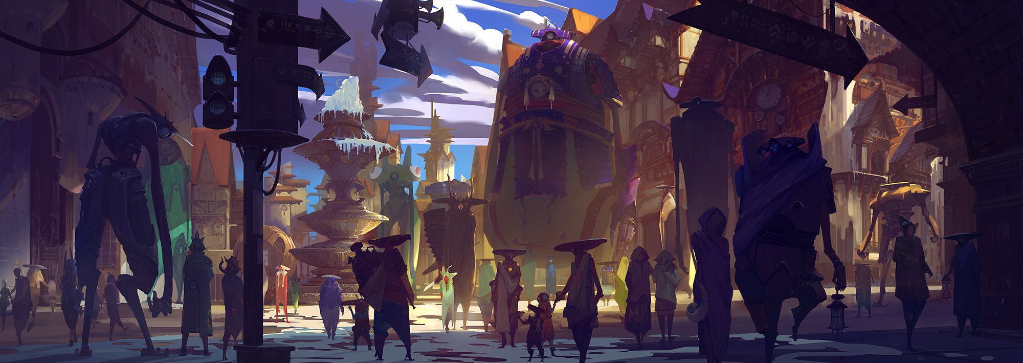 这是我自己的一个宏大的世界中的一个城市的表现,我称这个世界为蜡烛城,生活在这个世界中的居民各式各样,各种文化,种族在一起汇聚交流,这副图表现的是蜡烛城人类文化的国王大道,是一个比较繁华的地方,往来各地的人们在这里交易买卖。