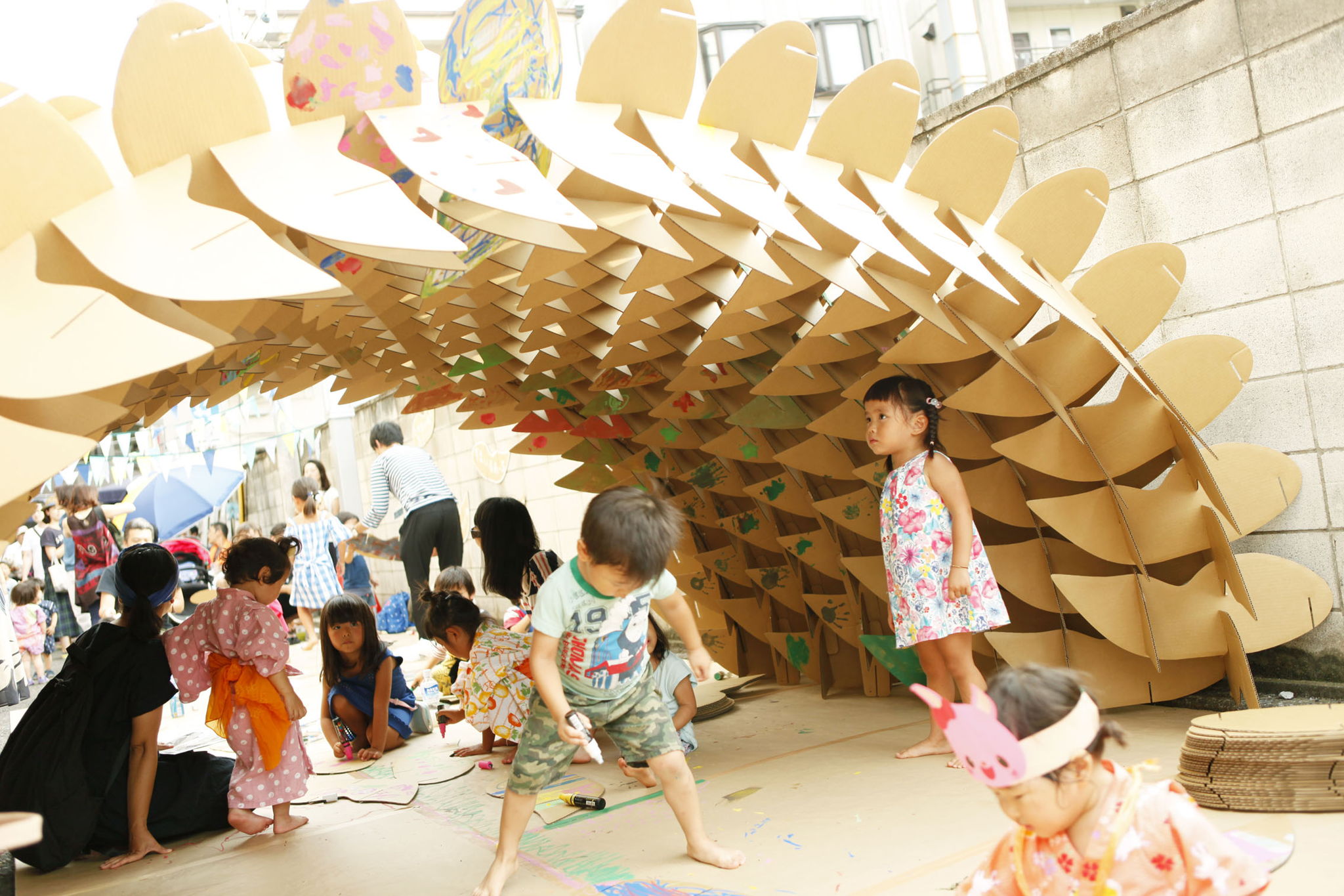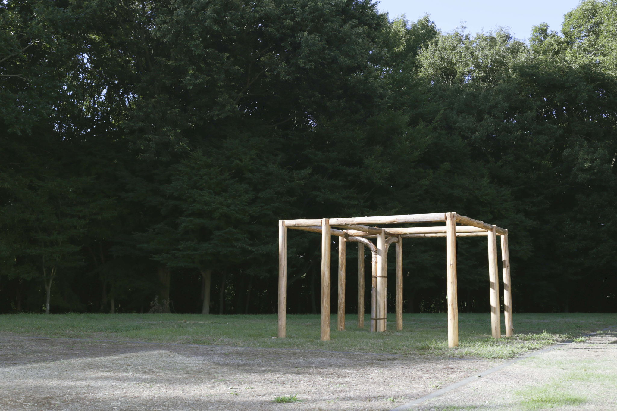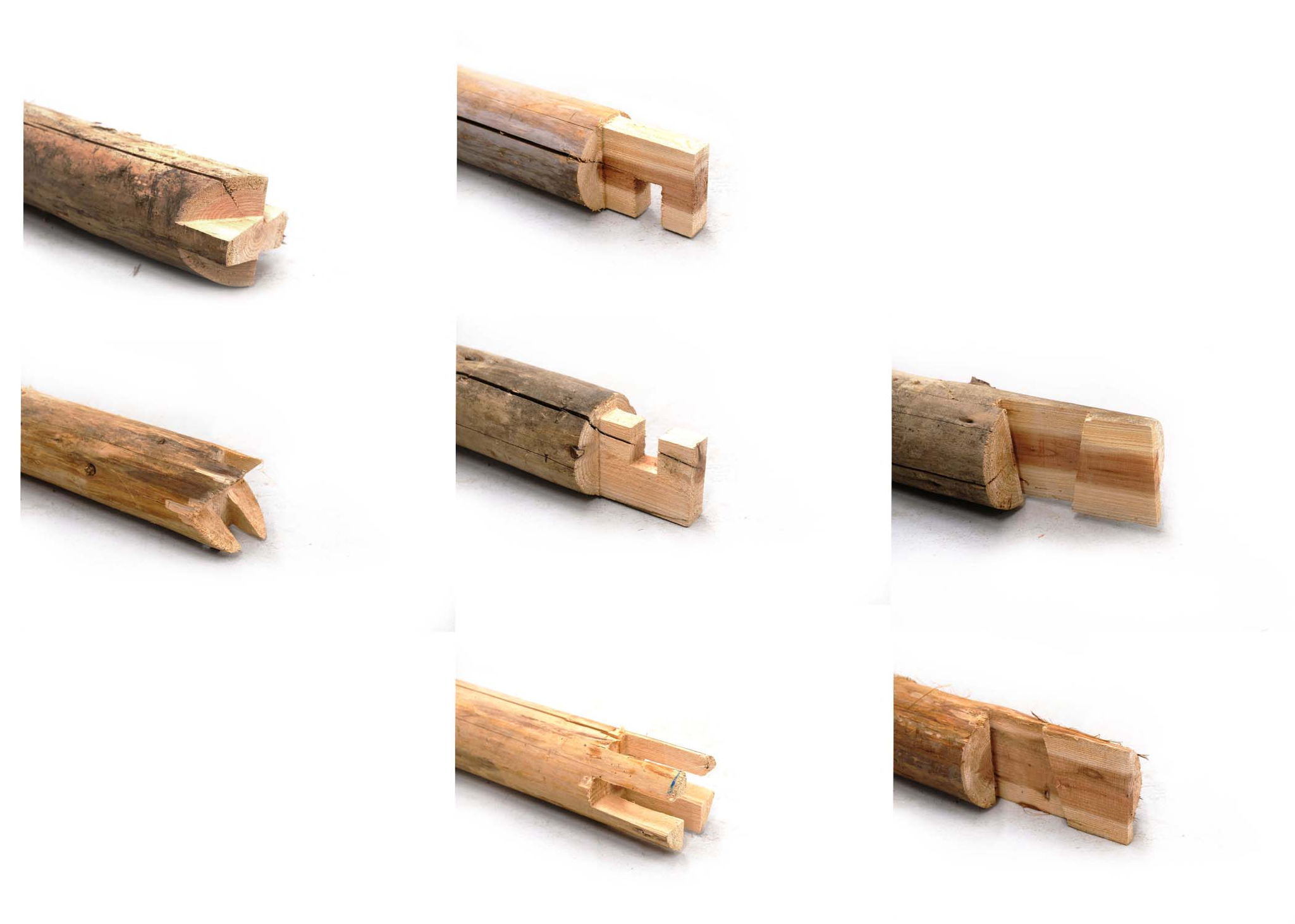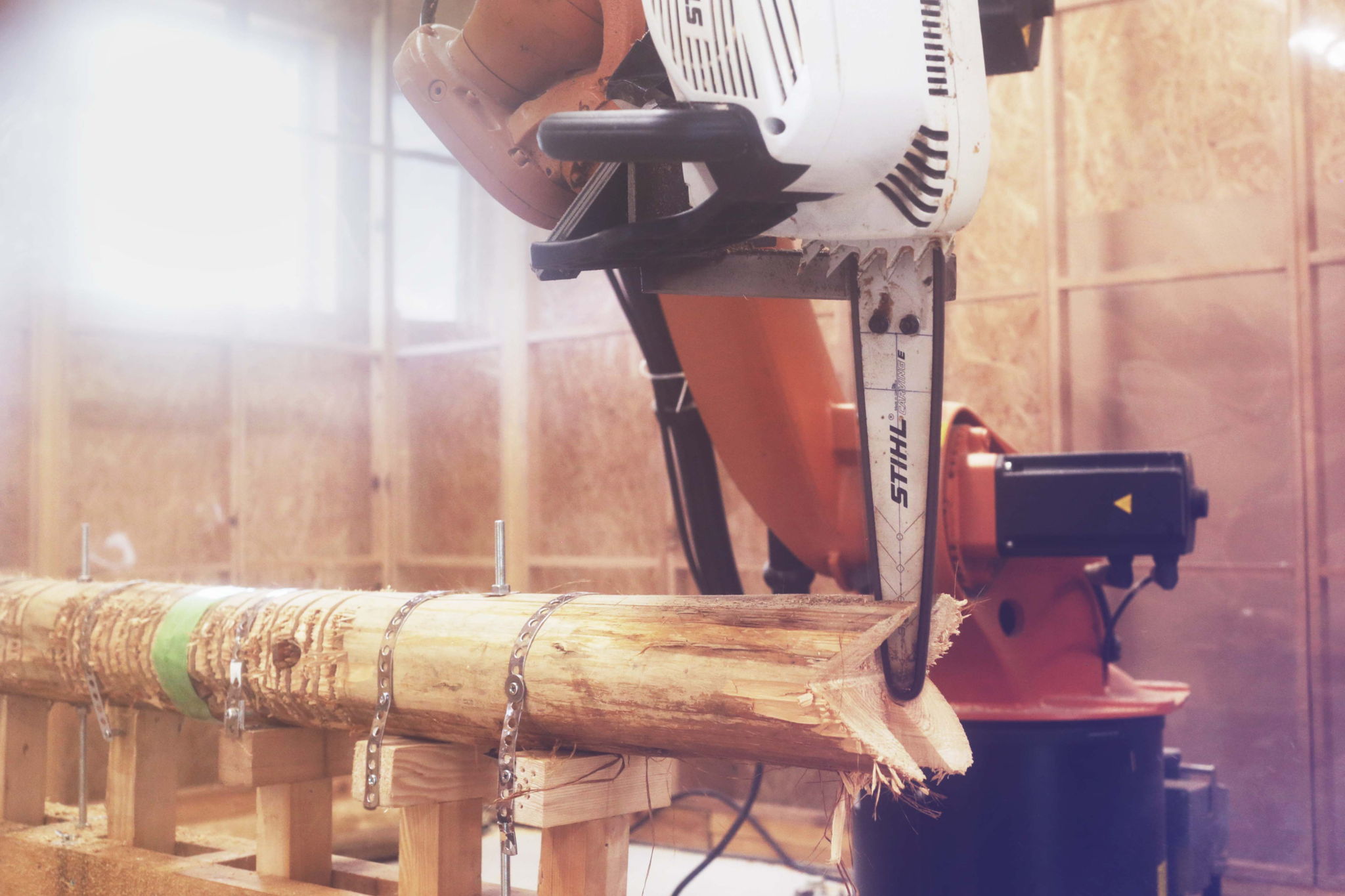 本プロジェクトは、デジタル加工技術による、未使用材の新しい加工方法を試行したものです。未使用材とは未発達材や間伐材、製材後の残材等、幹の直径が小さく、製材加工できず使用されない材木のことを示します。製材でない丸太材をデジタル加工技術によって、情報化し加工することで、規格化とは異なる新な生産方法を導き出すことを目的にしています。デジタル加工技術として、CADソフトのライノセラス、そのプラグインであるグラスホッパーによるシミュレーションでロボットアームを操作しました。ロボットアームは主に自動車の製造ラインなどで使用されている産業用ロボットです。今回のワークショップではロボットアームの先端に自作の冶具をつくりチェーンソーを装着することで、従来の加工技術では難しい丸太材を加工しました。