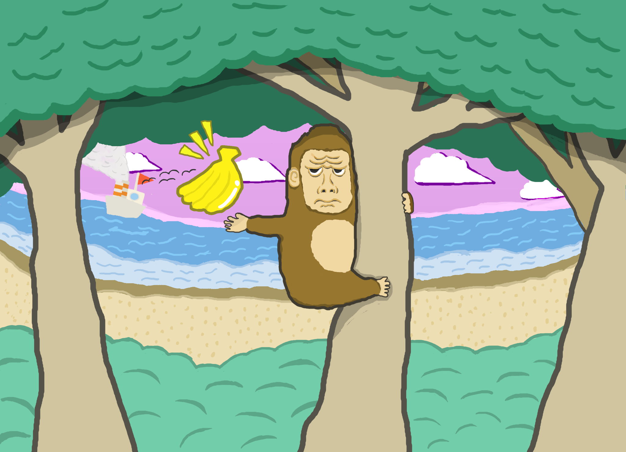 夕暮れ時の海岸沿い、バナナを掴もうとするモンキーっぽい