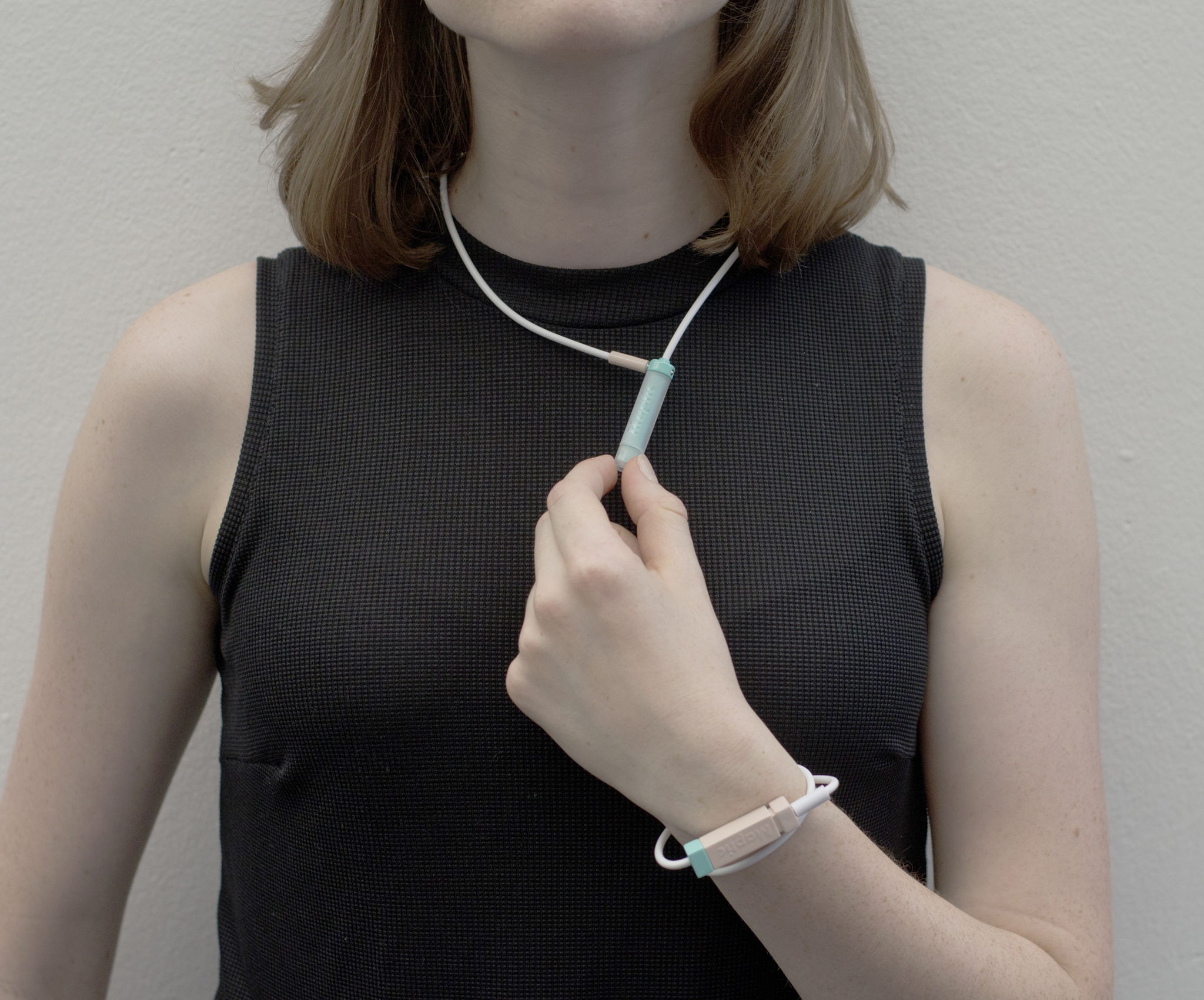 The units are versatile, and by unclipping the top section, allows the user to choose an attachment that suits their needs and style. Charged with a simple 3.3V headphone jack on a custom dock, the units can plug into themselves, creating bracelet or necklace appearances.