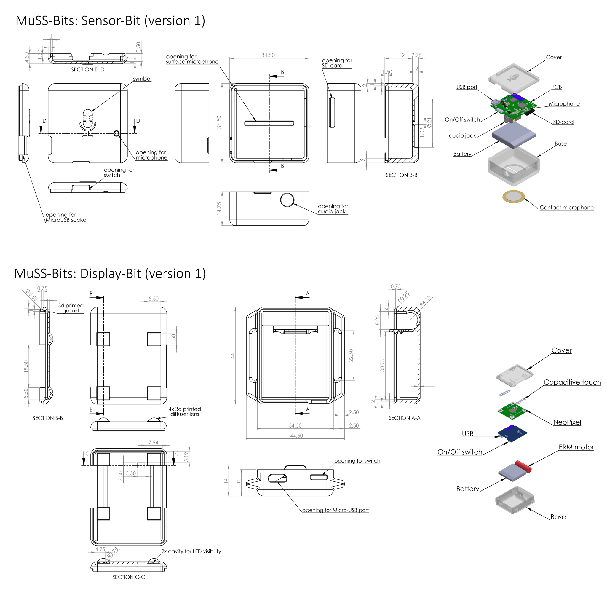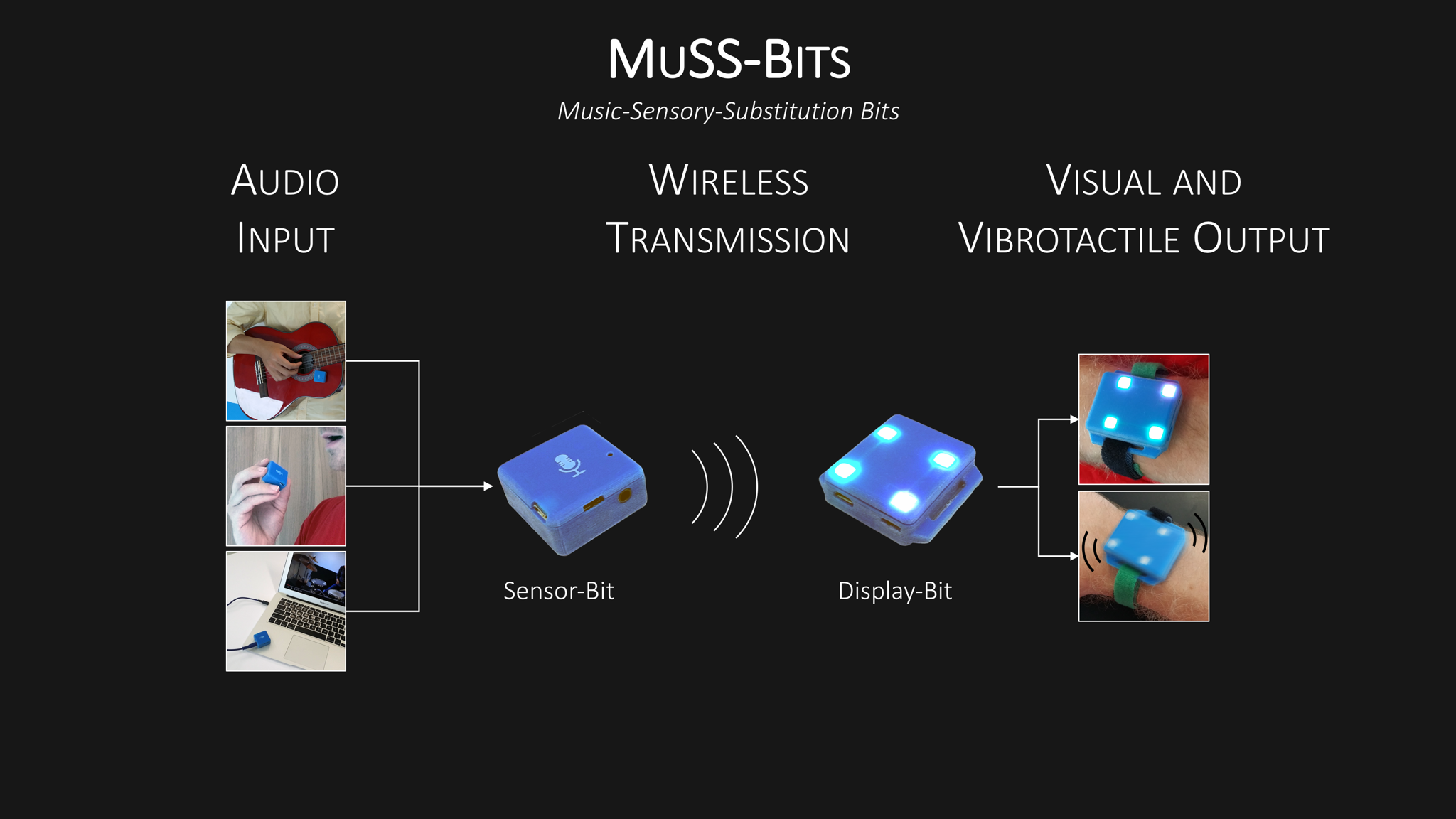 We conceptualized and developed Music Sensory Substitution (MuSS) Bits to support users with hearing impairments in music making activities. MuSS-Bits are small, plug-and-play, sensor-display pairs that capture and process sound from different real-world audio sources (e.g., musical instrument), communicate wirelessly and provide a visual and vibrotactile representation of the audio signal in real-time.