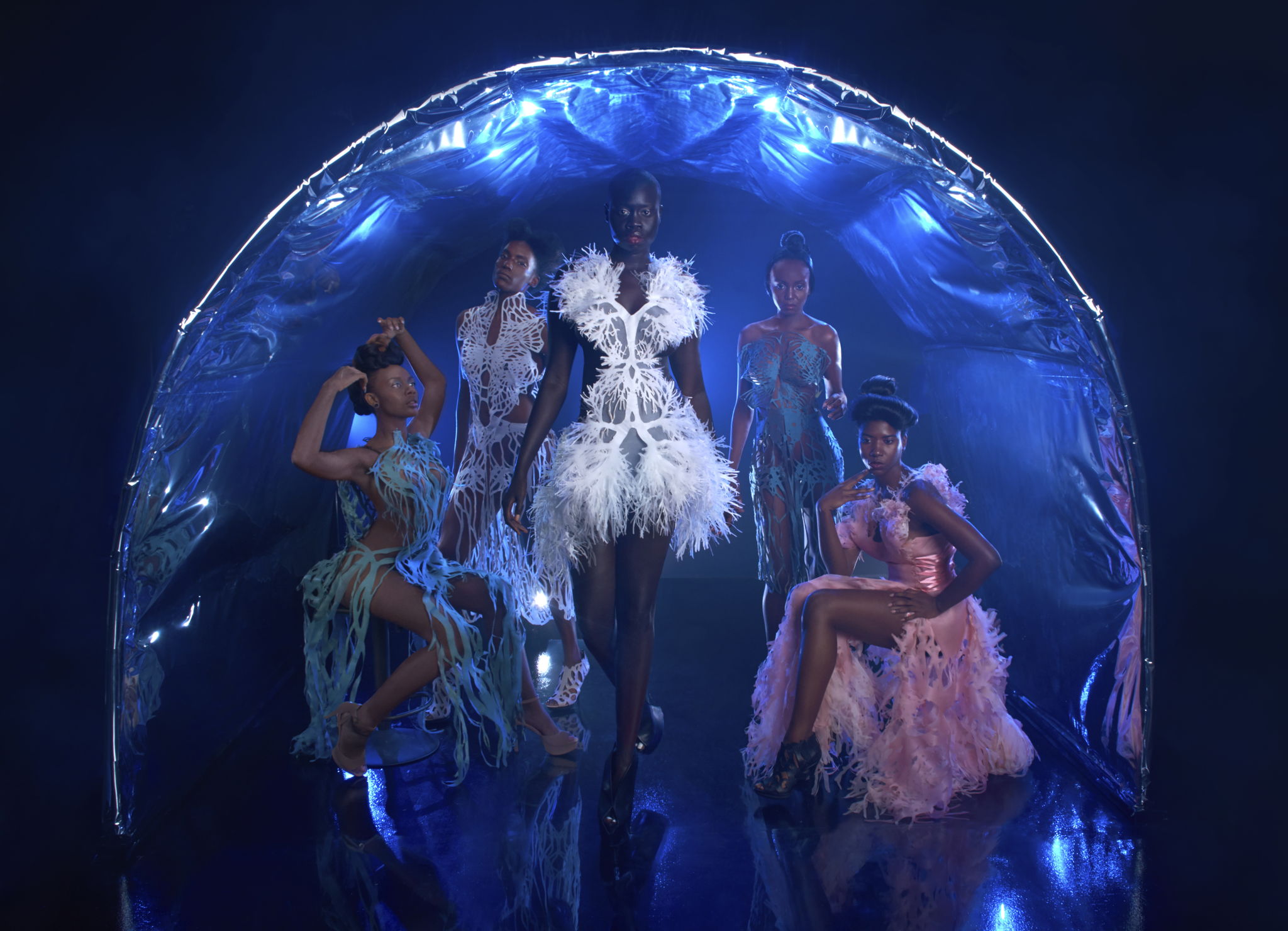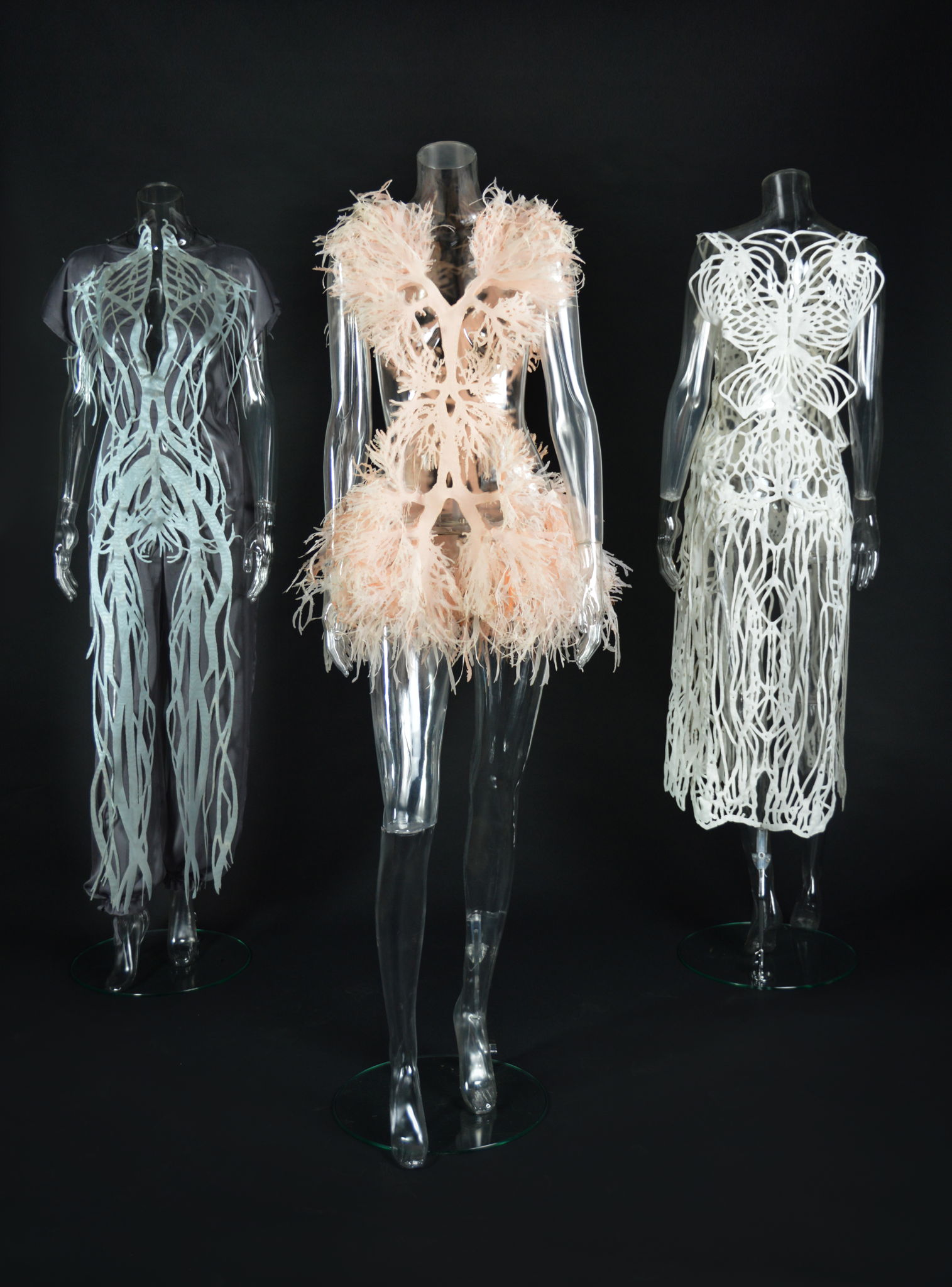 Merging fashion, biology and technology, these wearable art garments are based on different aspects of the human body: the human nervous system, lung, cardiovascular system and bones/ligaments. Each of the 12 pieces in this collection is created in a different method incorporating digital manufacturing and couture sewing techniques.
