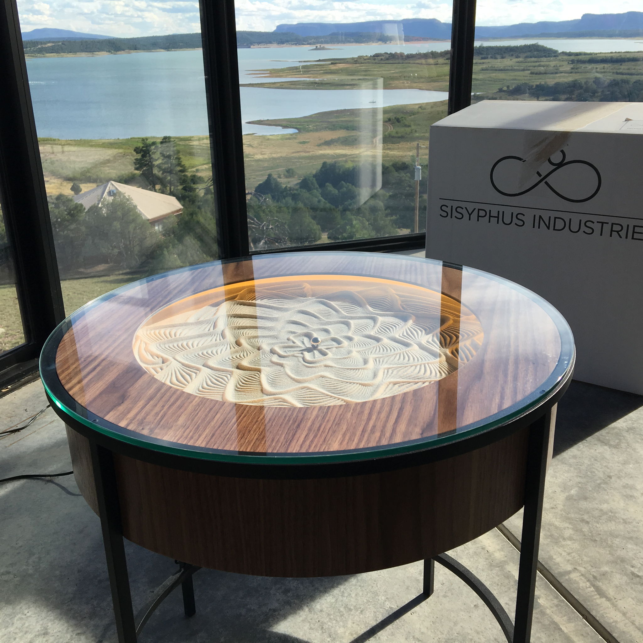 Sisyphus is both a kinetic sculpture, and an“instrument”. Unlike musical instruments, the “tracks” it plays are not musical, but paths in sand. Using motion control technology (CNC), it moves a magnet under a field of sand upon which a steel ball sits. Wherever the magnet travels, the ball is pulled with it. Track files are stored within its computer, and organized into playlists. After each track is complete, the next one loads and begins playing on top of it. As its namesake suggests, this process is intended to be eternal.