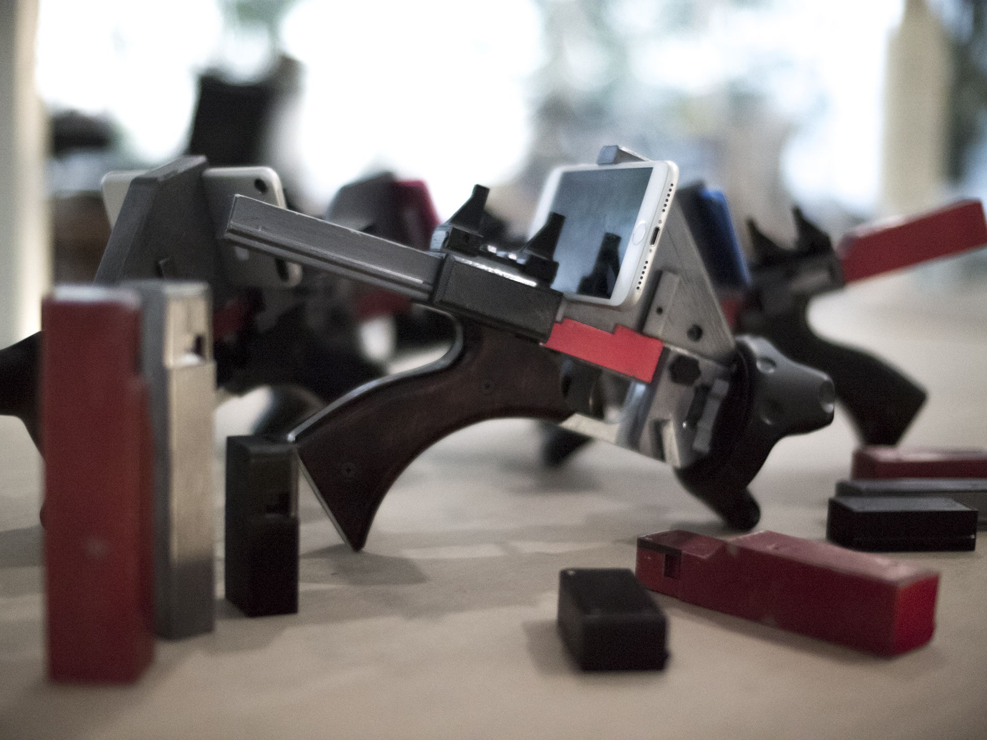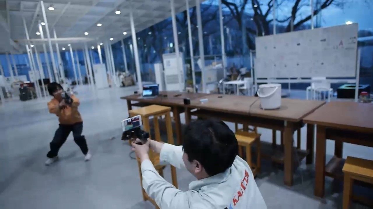 HMDのように映像で誤魔化せないため、実際のモノ感、操作性、質感、重量バランス、重さなどを重視して、子供から大人まで安全かつ気軽に楽しめる室内のサバゲーの対戦システムを構築した。銃型のデバイスにはスマートフォンとポジショナルトラッキングシステム、弾倉、照準器を備えている。プレイ中は一切スマートフォンに触れず、現実のデバイスを物理的に操作する。そしてスマートフォン上には周りに広がるVR空間が表示され、プレイヤーはそれを窓のようにしてその空間を自由に動きながら覗きこめる。実際の障害物を登録すれば、VR空間上にも同様の位置と角度で表現され、他のプレイヤーの位置にはアバターが表示される。実際のオブジェクトも相手も肉眼で見えているため、全力で身体を動かし、障害物に隠れ、走り回り、攻撃を避け、撃ち合うスポーツ的な楽しみ方を実現した対戦型のサバゲーである。