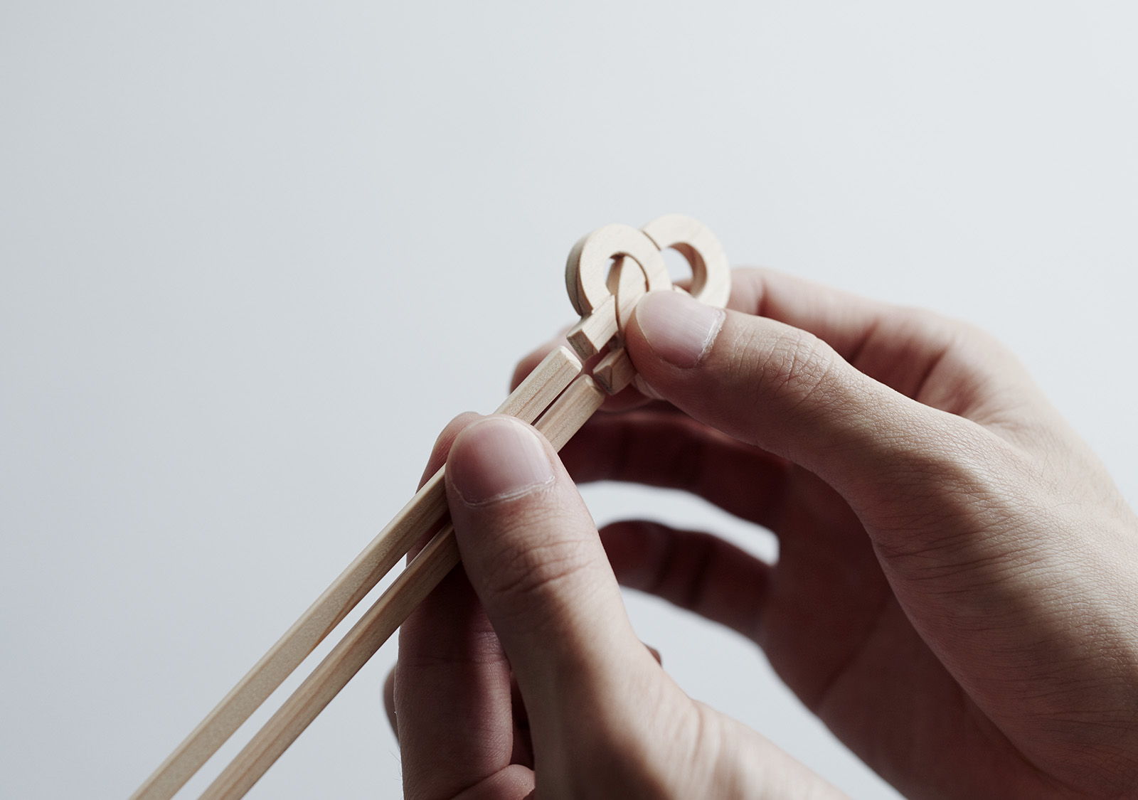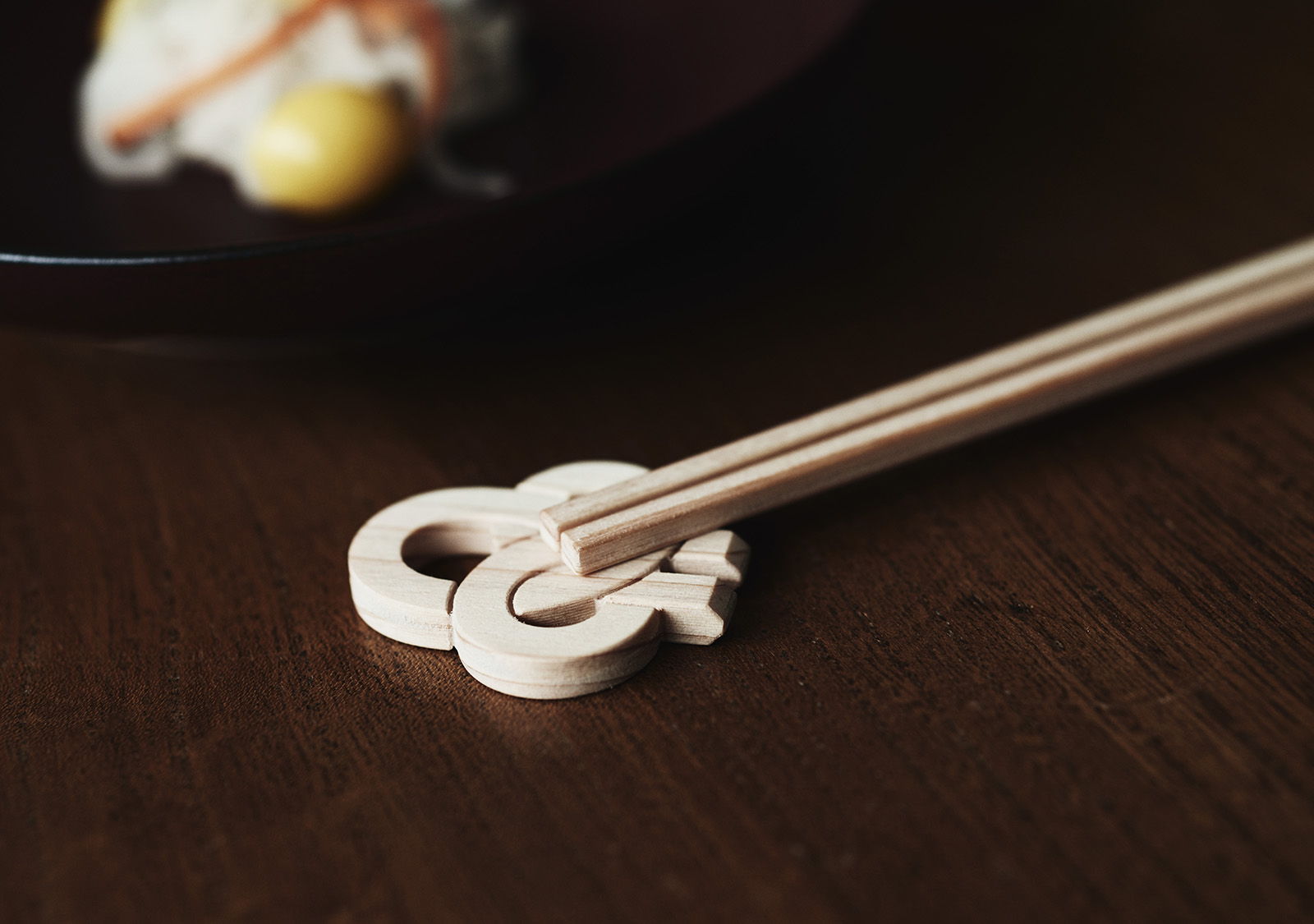 割り箸は、日本人の木の文化と共に生まれ、客人をもてなすハレの箸としても扱われてきました。そんな割り箸の短所は、割りにくさにありました。この結び箸は、1膳の箸を1本の紐に見立てており、箸同士が予め分かれています。結び目を持ち、箸の後端を折る事で、従来よりも美しく簡単に割ることが可能となります。紐の結び目は無駄にならず、箸置きとして使用できます。縁起の良い見た目の結び箸は、お祝いの場などでも喜ばれることでしょう。見た目にも、使い勝手にも配慮された、日本人の心づかいのかたちでです。