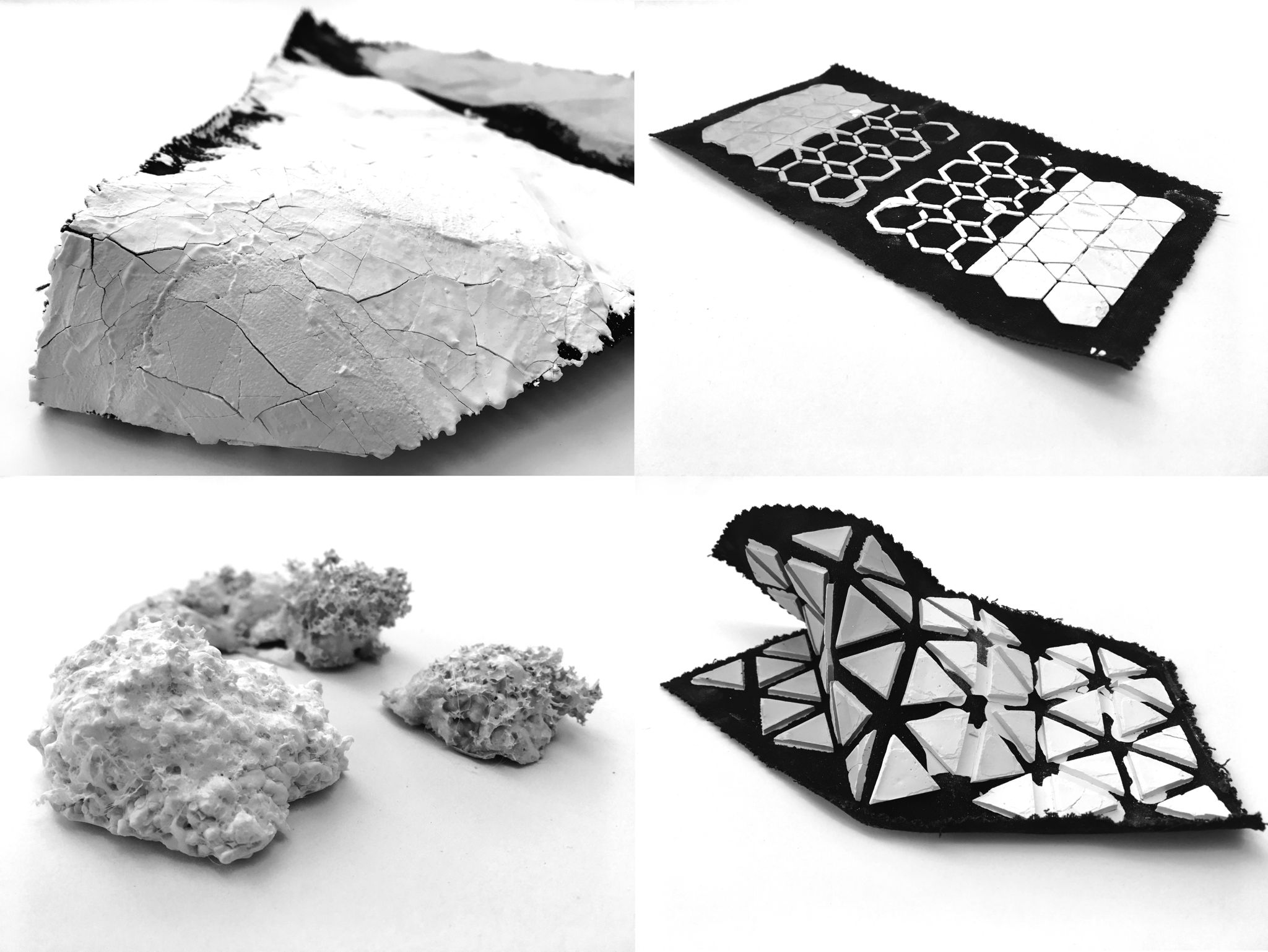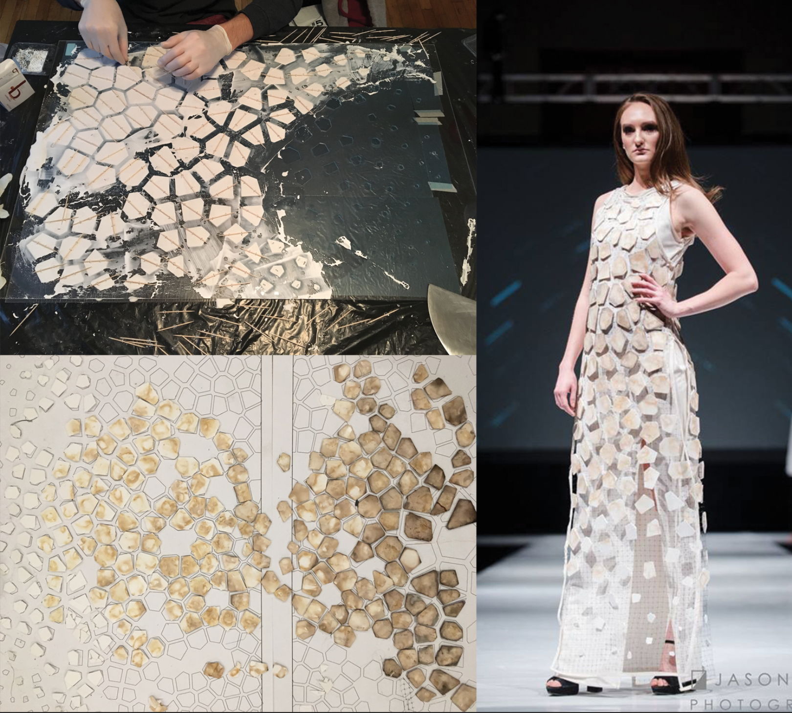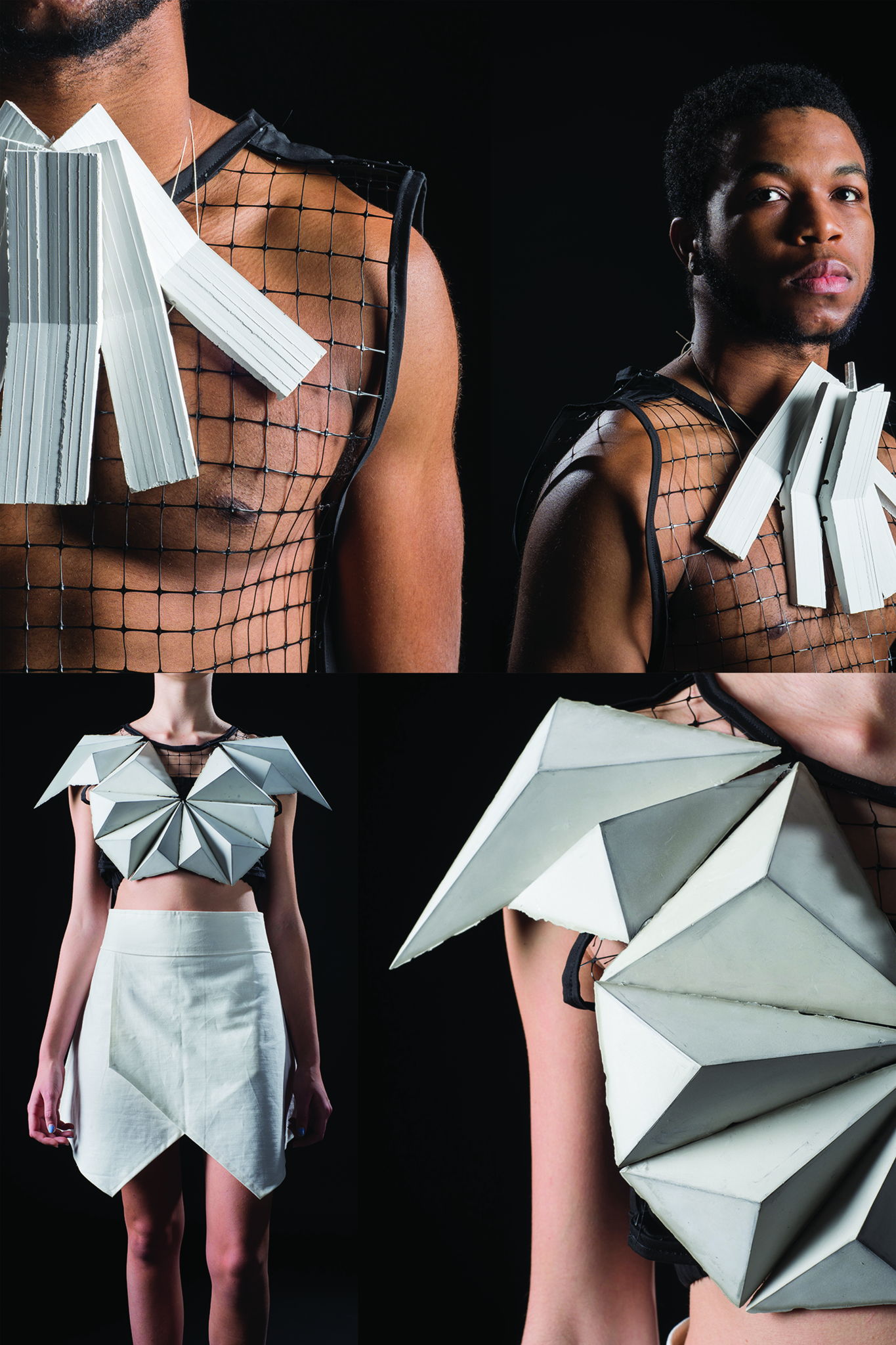 We fabricated a nine-look fashion collection which investigates the possibilities of implementing architectural casting as a method of producing wearable sculpture. De•struo explores the deterioration of rigid geometry on the human form through the transition of man-made shapes to more organic forms. This project both tests and challenges the physical and situational boundaries of cement and plaster casting. Casted artifacts were transformed into wearable textiles thus blurring the line between construction and fashion. The gradual dissolution of rule sets, to a varying degree in each garment, highlights the human figure in new ways. The collection also welcomes how geometric and pristine elements can be burned, cracked, and ruined much like in our surrounding environment. The result brings out a new beauty that can be found by putting together the remains of rubble.