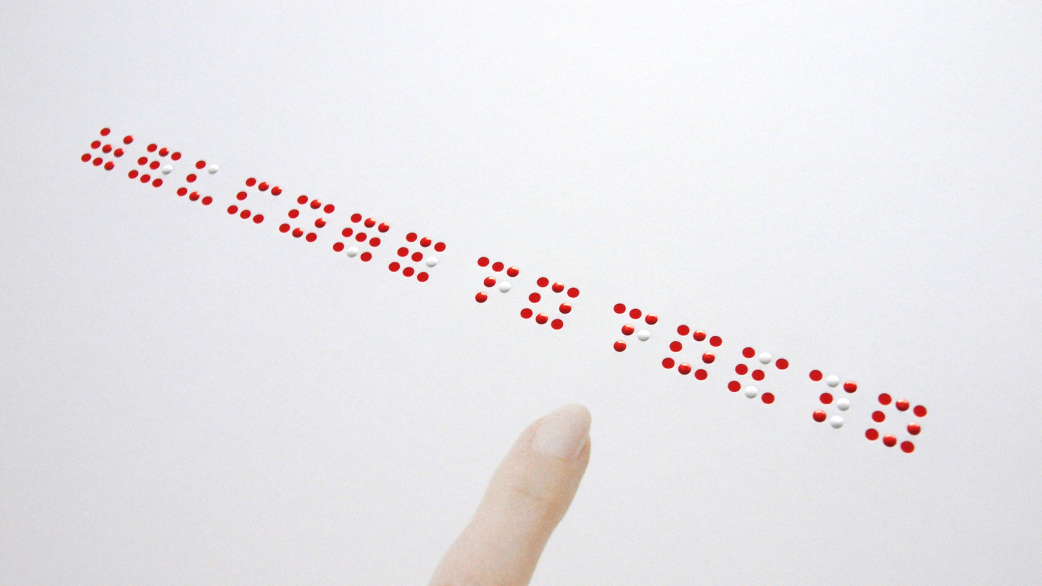 「dot/braille」は、ドットグラフィックと点字を融合させた3Dフォントです。3×3のフォーマットのなかで、共通の視覚情報と触覚情報をあわせ持つことによって、視覚に障がいのある方を含めたすべての人に同じ情報を伝達することができます。これは、グローバルな都市のサイン計画やユニバーサルなプロダクトの創造にあたって、デザインの力で身体的な境界をつくらない社会を目指す実験的な試みです。視覚情報と触覚情報がお互いにポイントを共有しあうことで、例えば、視覚的にも英語のAであり、点字でもAの意味を表します。英語と数字の点字は世界基準であることから、一連のフォントデータとして活用できるグローバルなフォーマットになると考えました。