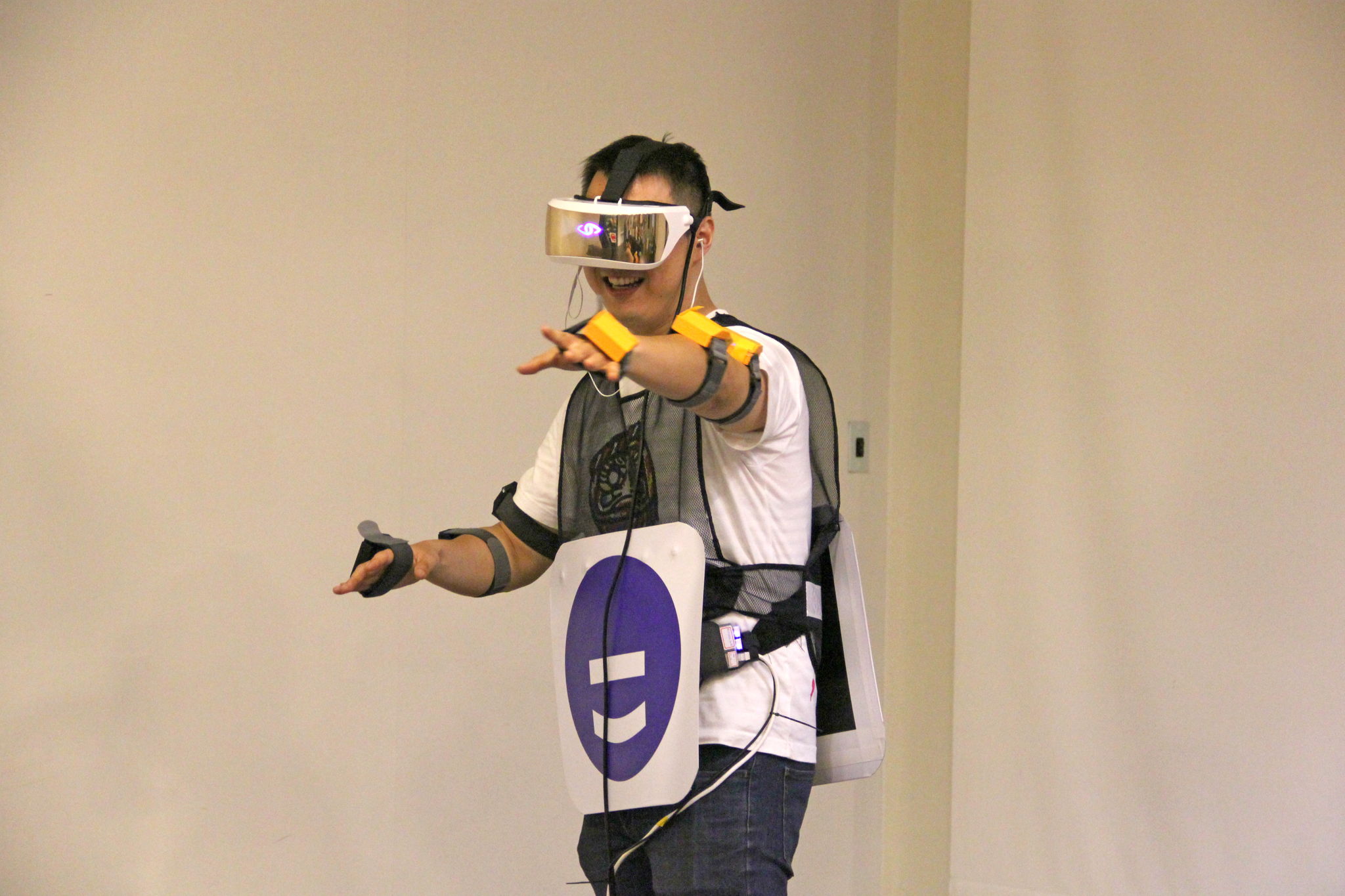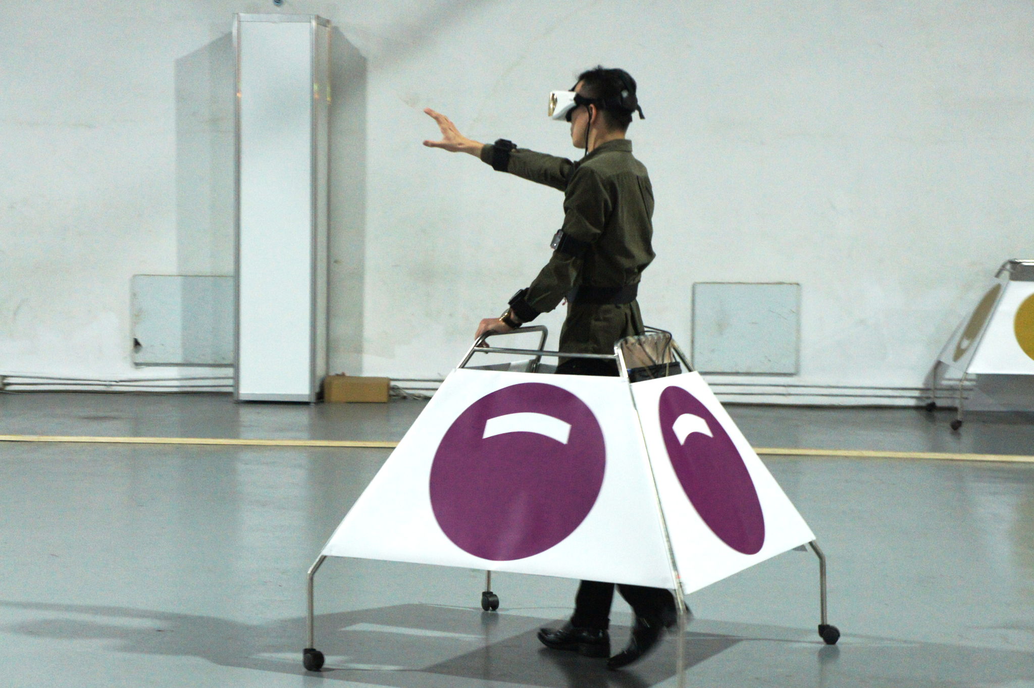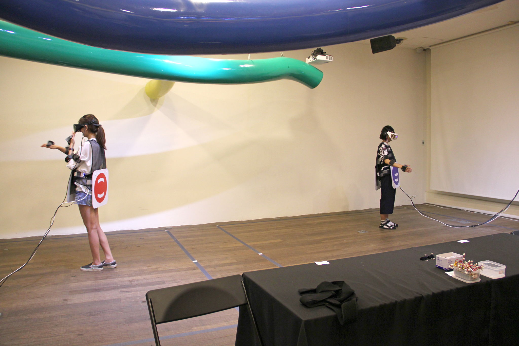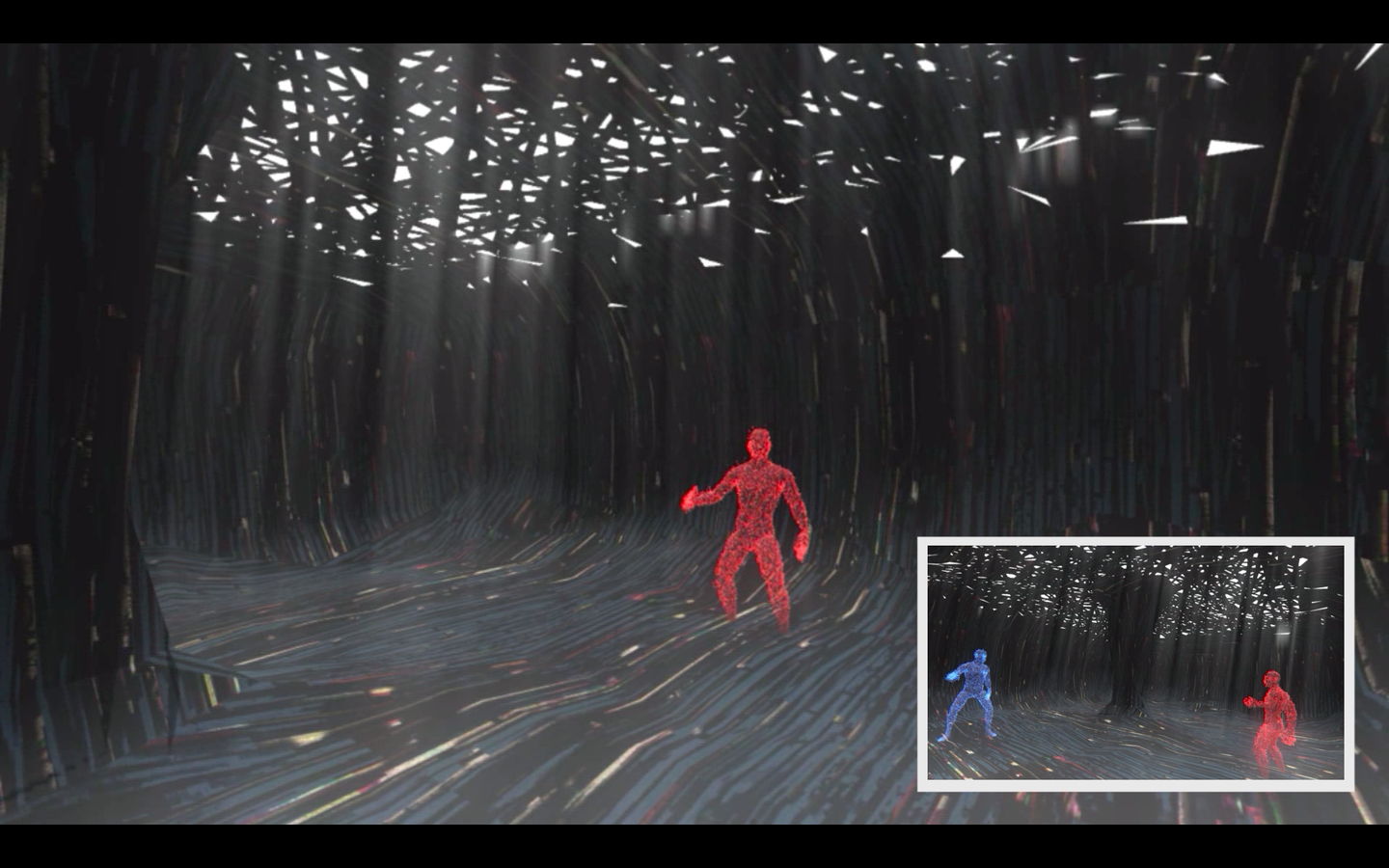 Rather than treating virtual reality as dialectics on a state of consciousness where reality and the body disappear, Dream-In-Dream-Out sees it as the unfolding of "new reality, new space, new body". The project attempts to create an "all-writing" and "all-information" interactive and performative space by combining elements such as bodily perception, rhythm, movements and positions using smart glasses as a wearable wireless sensor system. Participants wander, traverse and interact in the boundlessness of virtual space and discern a fantastical multidimensional volume that slowly shifts, expands and fractures. Wearing a lightweight wireless sensor device, their bodily perception, rhythm, movements and positions are led into a world of virtual reality where they may frivolous traverse and interact.
