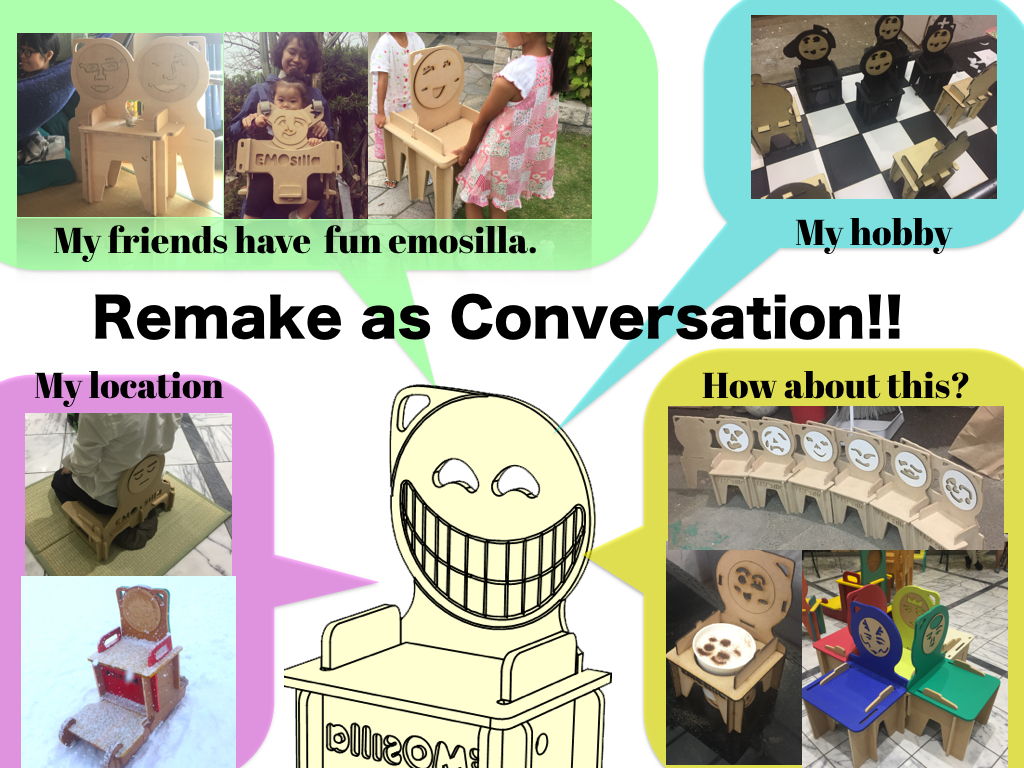 Our work is interaction itself, as conveyed through the digital teaching aid "Emosilla", Emosilla's numerous remakes, and our own digital fabrication that created those remakes. Emosilla, by Ilaria, was designed in South America, and is a combination of “emotion”and "silla" (chair) made with simple construction and digital devices. In July 2016, online interaction that started with "Emosilla de Geminis", a set of data that Kato shared which was redesigned for young sisters, led to the production of over nine type remaked forms in a single year, each of which reflected each life background. We all shared design data with each other, and in August 2017 we held a collaborative workshop based on several different types of Emosilla at Fab13 in Chili. Even now, Emosilla continues to produce remaked forms.
