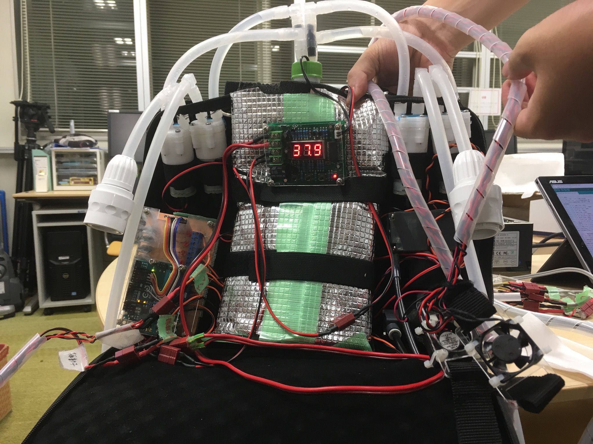 私共の開発した失禁体験装置は体験者にまるで失禁をしてしまったかのような感覚を提供します。本技術により人体の尿意、排尿感といった生理感覚の認識、解析が容易になり、人間工学の一助となります。本デバイスのシステムは腹部に装着した圧迫機構により膀胱を圧迫し尿意を感じさせ、股間部及び内股に取り付けた水袋に温度制御されたお湯を流すことにより失禁時の尿の温かさや水流を感じさせます。そのほかにも股間部へペルチェ素子による冷却を行うことで尿意を強く感じさせたり、首筋へ振動と冷感を与えることで排尿時の身体の震えを再現します。これらの刺激を統合して体験者へ与えることで尿意と排尿感を疑似的に再現します。