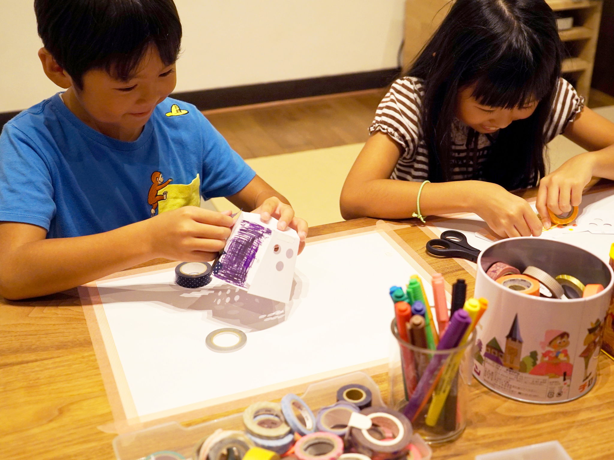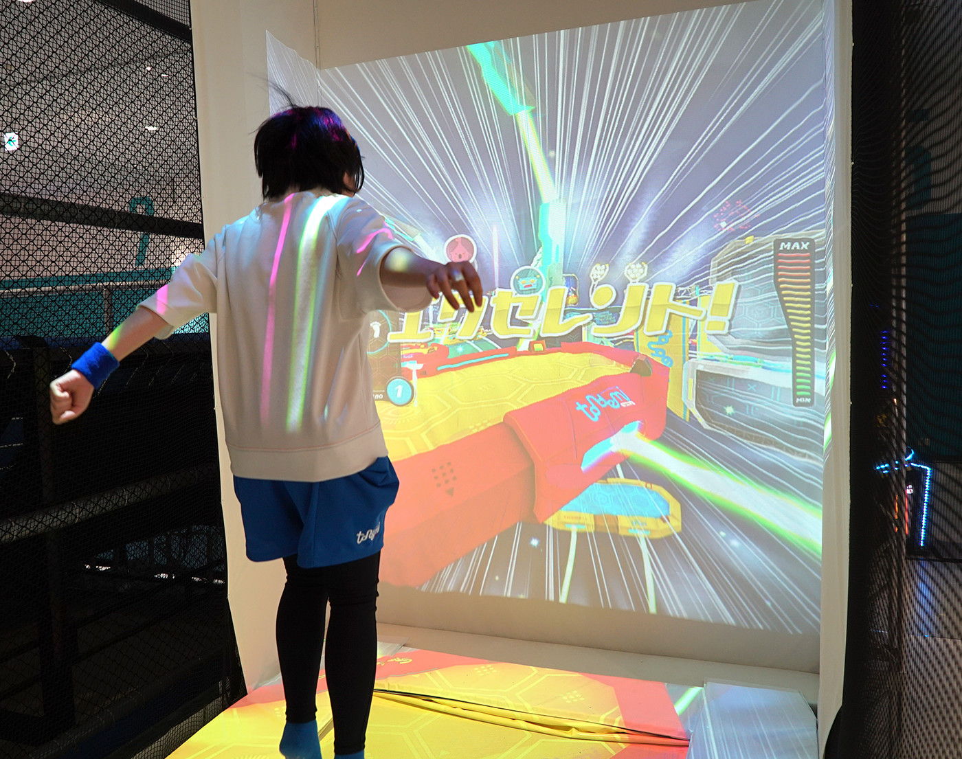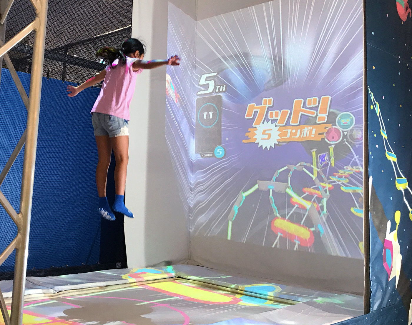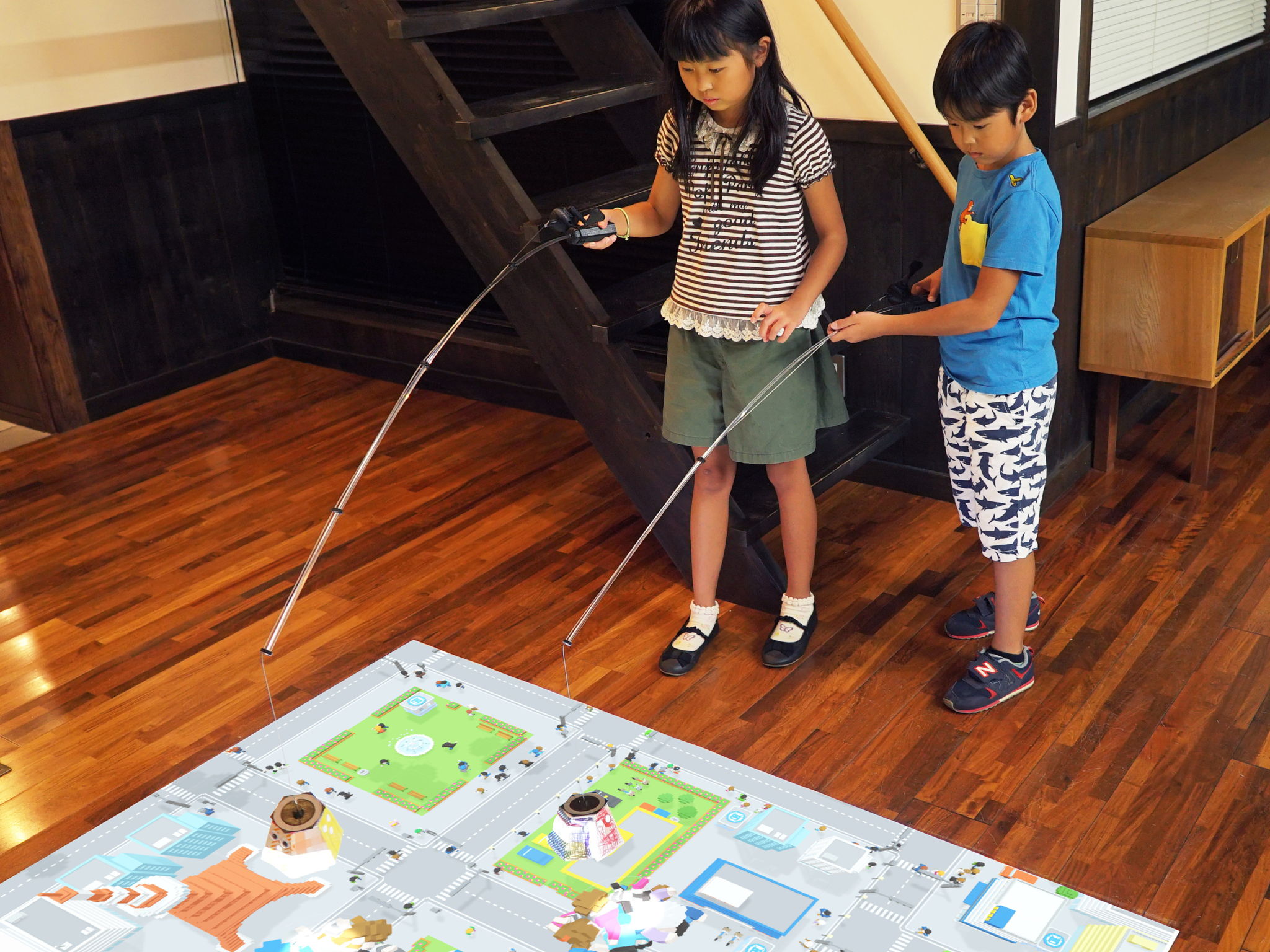 体験者はまずペーパークラフトでオリジナルUFOを作り、釣り竿に装着します。体験スペース床面にはプロジェクターによって上空から見た街が映し出されており、UFOをかざすことで街内の建物や人を吸い込むことができます。他の参加者と協力し制限時間内にどれだけ沢山の人間を吸えるかを競います。