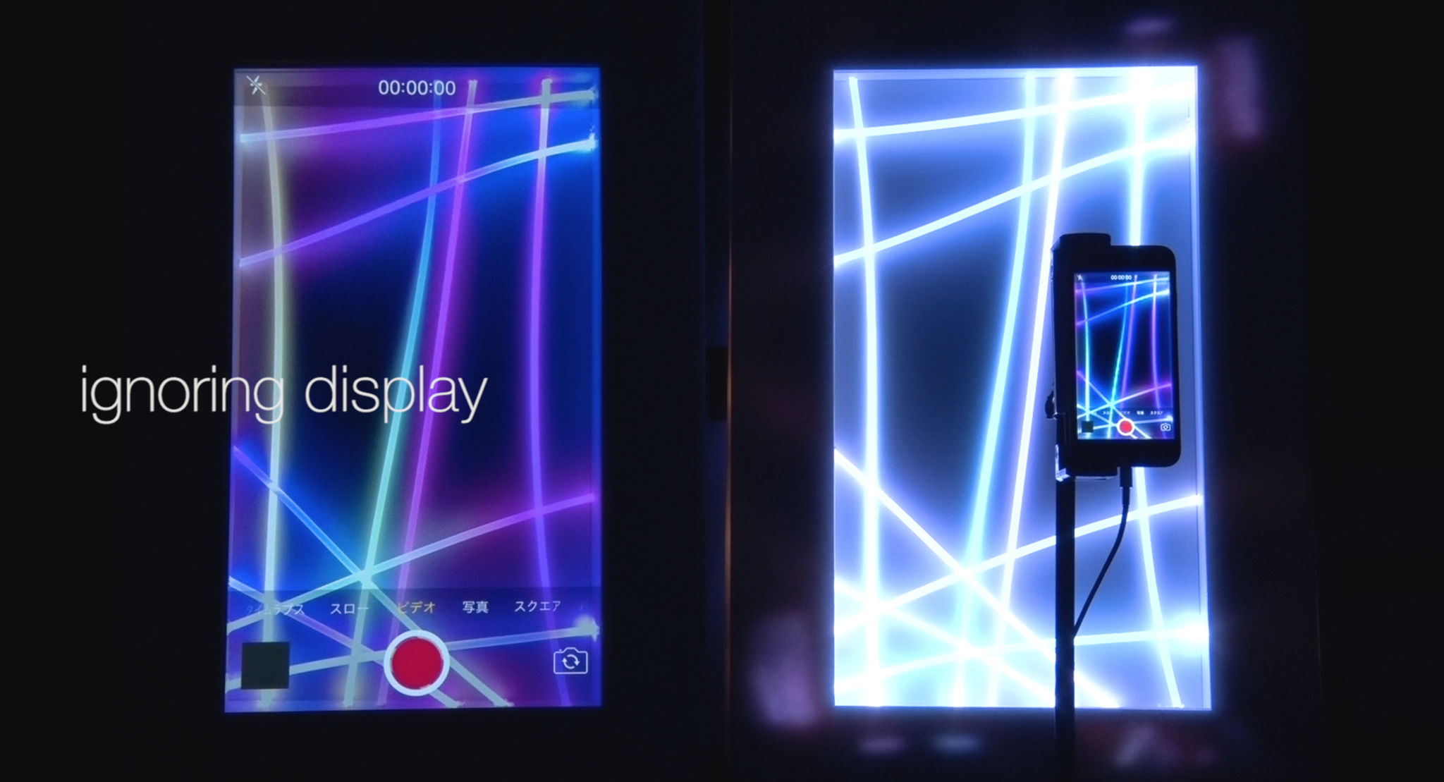 This is a technological installation, which ignores humans. It receives flicker phenomenons from a screen, in conjunction with the FPS of your smartphone camera. This lets you perceive the difference between the umwelten of humans, and their machines. By interacting with the touch screen, you become aware that you are neglected as a human. You communicate with a technological lifeform, invisible to the naked eye.