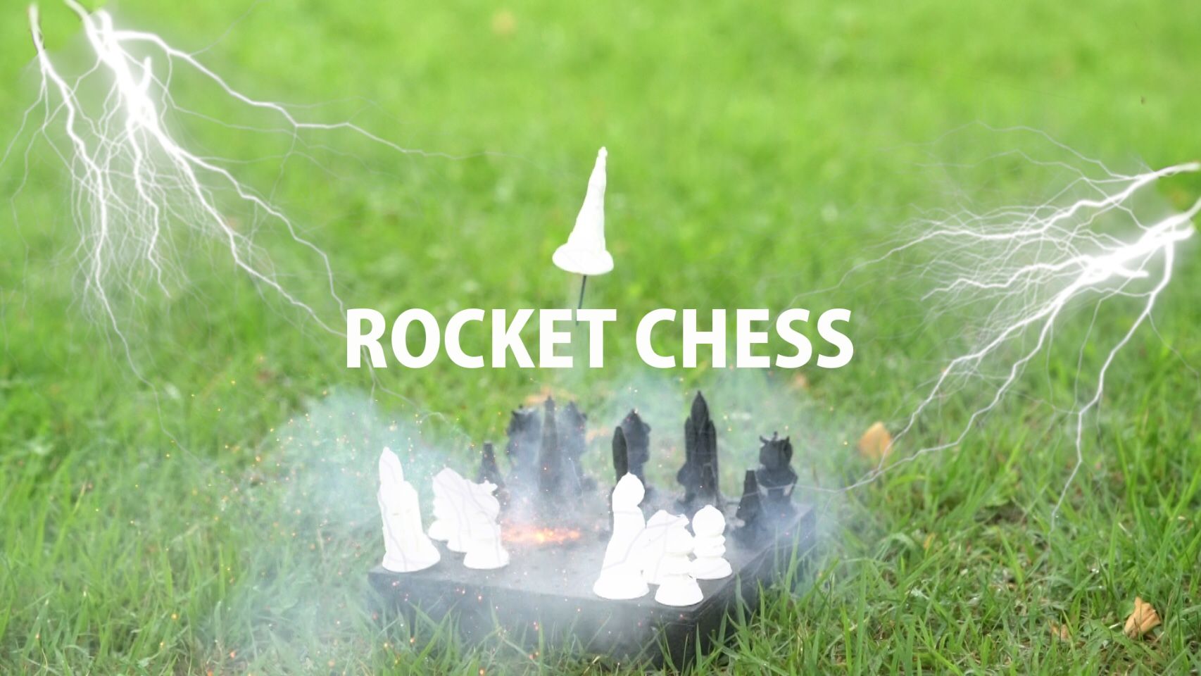 ロケットチェスはロケット花火とチェスを組み合わせて”打ち上げ”と”爆発”を演出したボードゲームです。米ソ冷戦時に開発されたロケットを模した駒にはロケット花火が差し込まれていて、駒をとる際にはチャッカマンで着火して打ち上げ、上空で爆発させます。