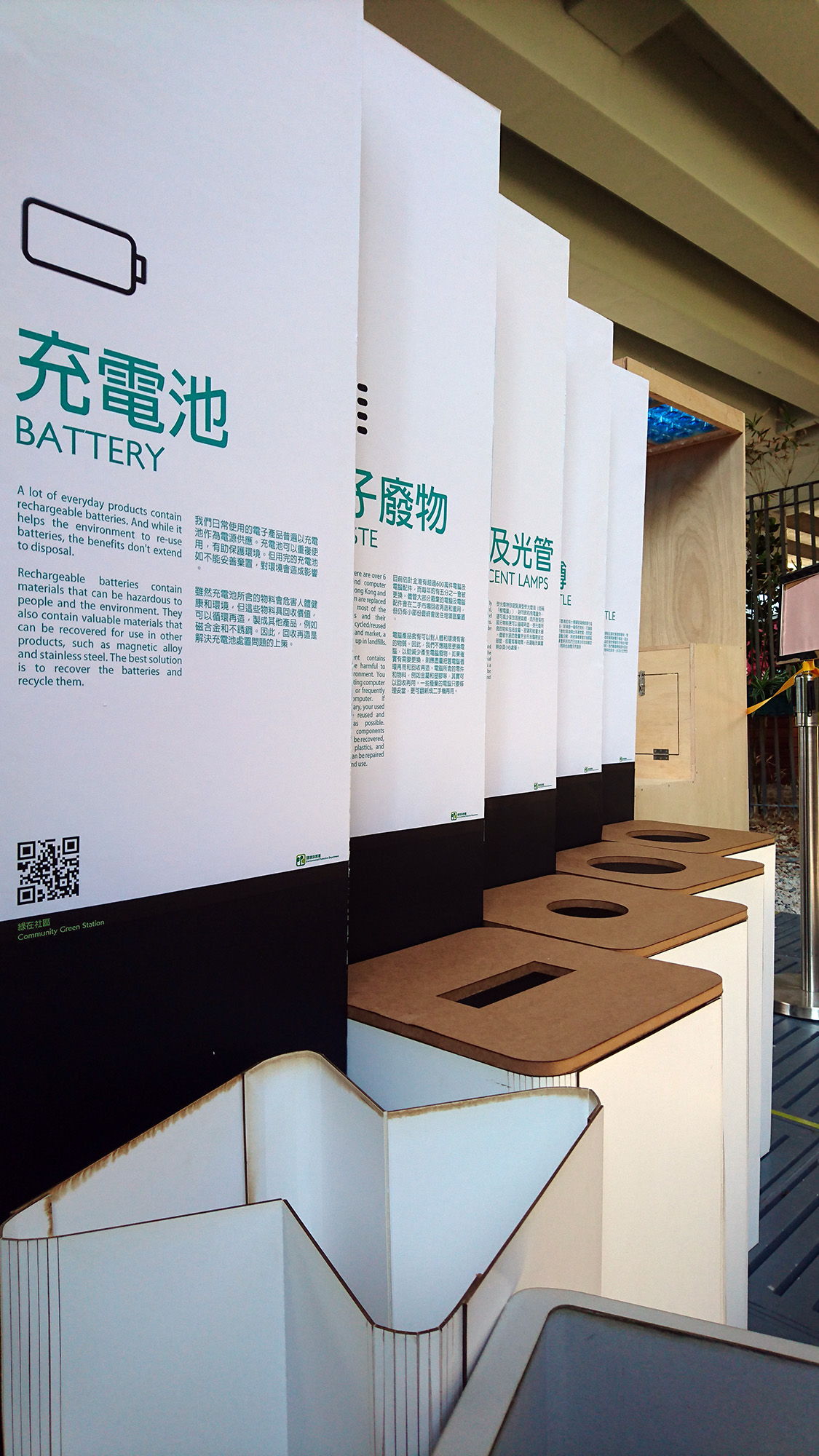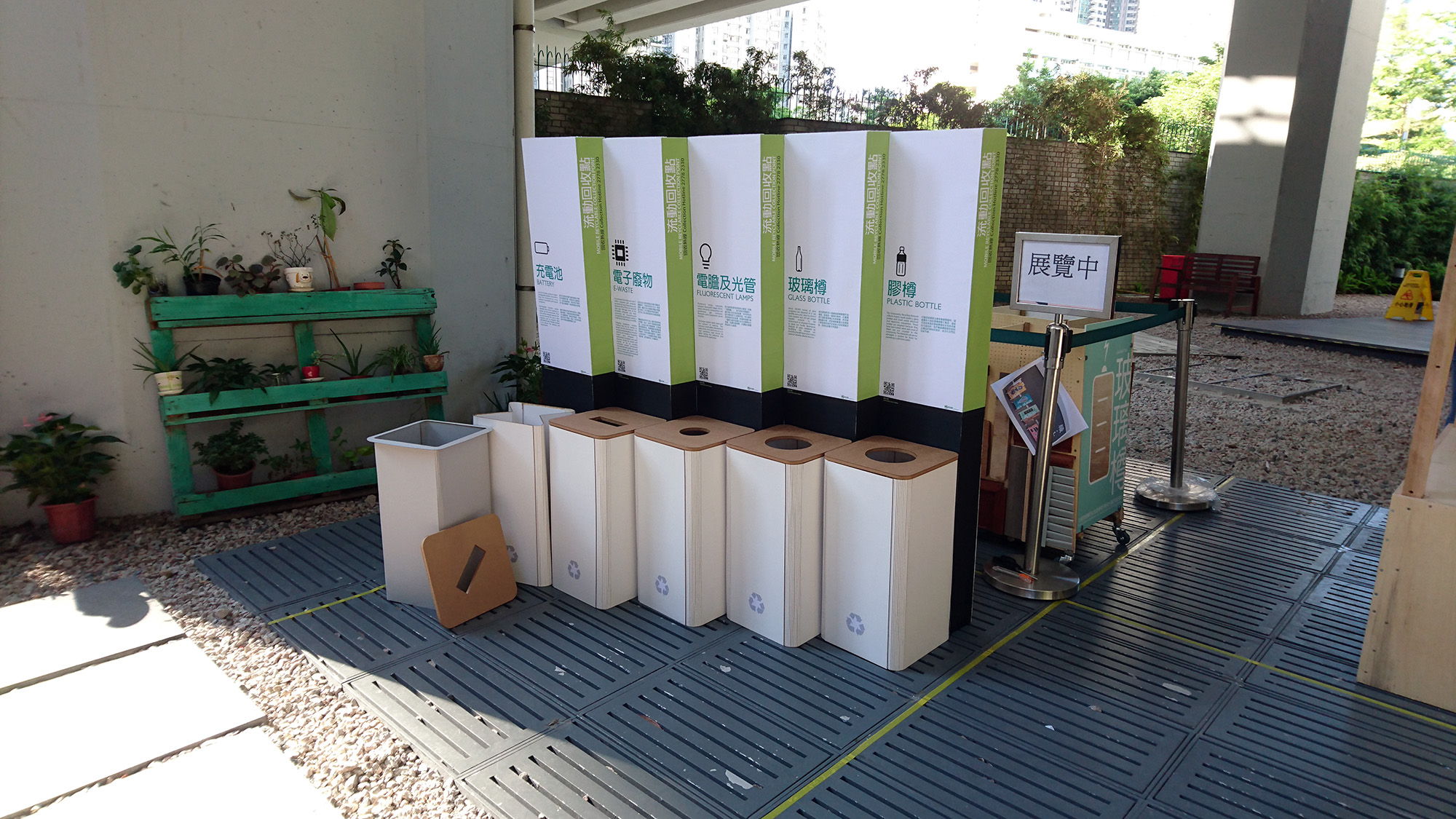 Our design for a series of recycling bins in Hong Kong uses a collapsible design that unfolds to create a bin when in use and folds flat for transit. The humanistic design considers the ease of use for both the person setting up the bin and the public which uses the collection point. Due to the simplicity of the design, the materials used can be reduced to only plastic and bamboo, the former of which may be made from recycled plastic and the latter of which is highly sustainable.