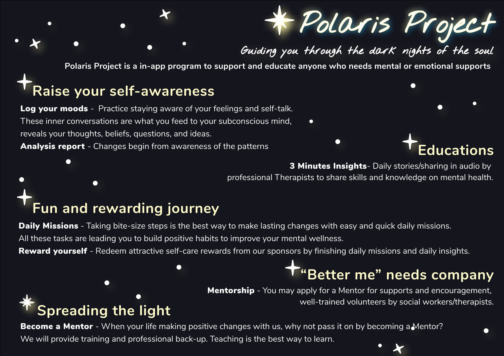 Polaris Project is an in-app program to support and educate the public, plant the seed to make emotion self-care a common sense, showing how instead of overwhelming positive and fancy articles. Provide supports to anyone in need.