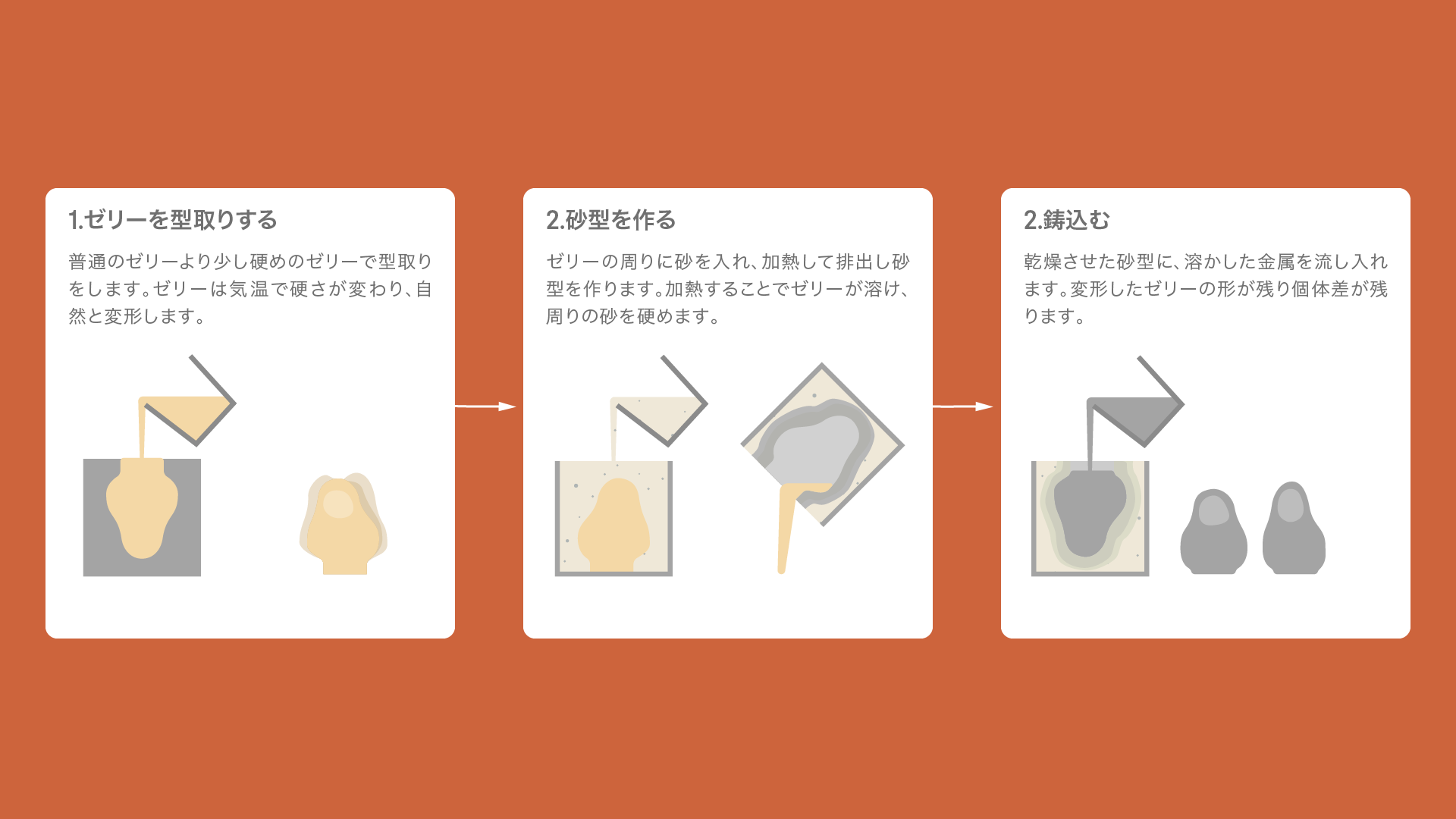 製造方法は通常の鋳物の原型で使うワックスをゼリーに置き換えることで、少ない設備投資で誰でも簡便に生産でき、プロダクトには自然と個体差の生まれる製造方法を考案。ペーパーウェイトのDARUMAを制作しました。
