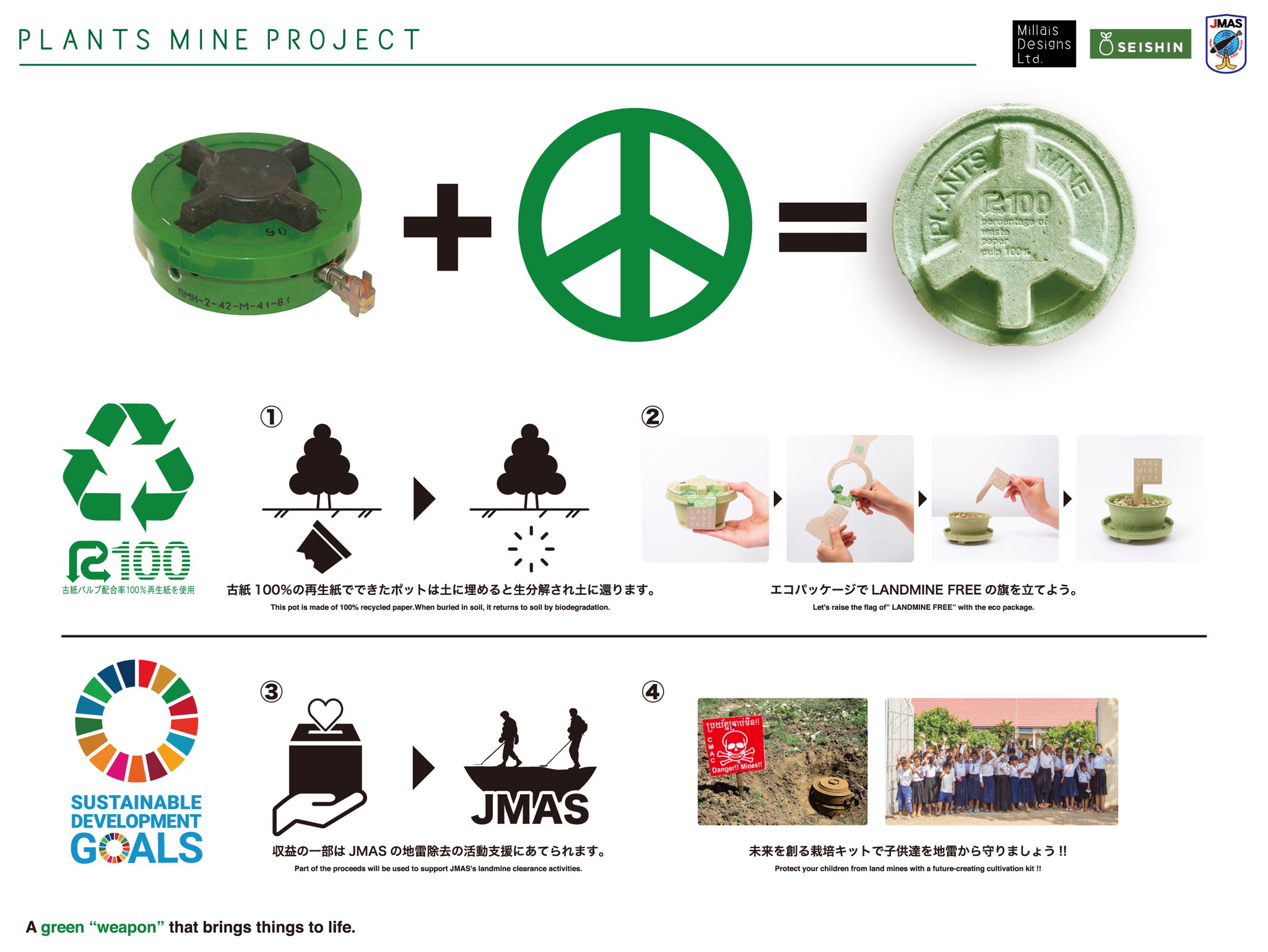 PLANTS MINEは「安全と発展への支援」「平和への認知拡大」「環境配慮」をコンセプトに制作されており、古紙100%のポットは室内栽培可能かつ、植え替えまたは廃棄時に土に埋めることで自然に還ります。キットに同梱される種子"きっと見つかる四葉のクローバー"には平和への願いが込められています。また土に埋める際に地雷の設置を擬似的に体験することにより、簡単に設置でき、一度埋められると誰かが踏むか、もしくは、取り除かない限り半永久的になくなることはない非人道的な地雷に対する問題を学ぶことができます。PLANTS MINEは本体カラー、同梱する種子(花言葉)を変更することで多様なメッセージを表現できる拡張性を有しており、 LANDMINE FREEに賛同する様々な企業・団体とのコラボレーションが可能になります。