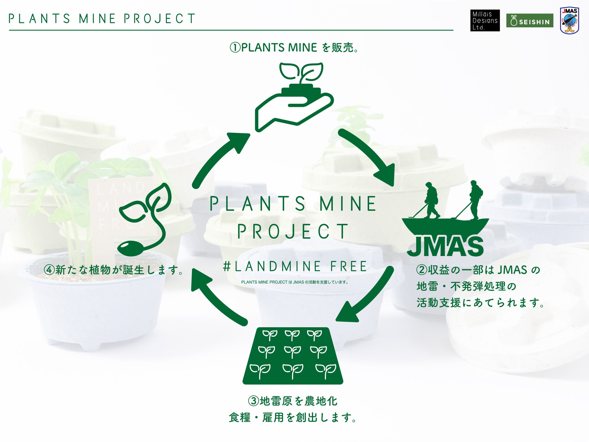 「植物とデザインで社会に貢献する」パンデミックが人々の生活に引き起こした様々な変化の中にインクルーシブ・SDGsへの意識とインテリアグリーン需要の高まりが挙げられます。 植物と親しむ機会がなかった人でも簡単に育てられ、環境に対して直接アプローチできるプロダクトを創造できないかという問いに対してのひとつの回答。それが“Plants mine project”です。 今もまだ60の国と地域に地雷が埋まっています。被害者の71%は戦争と関係ない市民で、 そのうち54%は子どもでした。 1999年から2018年の20年間に報告された被害者数は世界で13万人以上にのぼるとされています。“Plants mine project”は認定特定非営利活動法人 日本地雷処理を支援する会(JMAS)と協力し、収益の一部はJMASによる地雷・不発弾処理、農地整備、教育環境の整備等の活動支援にあてられます。