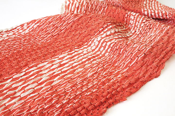 この実験的なテキスタイルデザインは、現代的な方法によって既存の伝統的なプロダクトをハックすることにより開発したものである。日本のテキスタイル産業は、環境問題や高齢化による後継者問題などに直面した斜陽産業であり、丹後産地もその例に漏れない。縮緬生地は、その地域特有の気候風土を背景に、300年以上も継承されてきた技術の結晶であり、「素材」としてのポテンシャルの高さに驚かされる。既存のイメージとは異なる、新たな丹後ちりめんのあり方をサステナブルな方法で提案することは、職人や産地に関わる人々にインスピレーションを与え、産地の人々を活気づけるきっかけになると考えた。