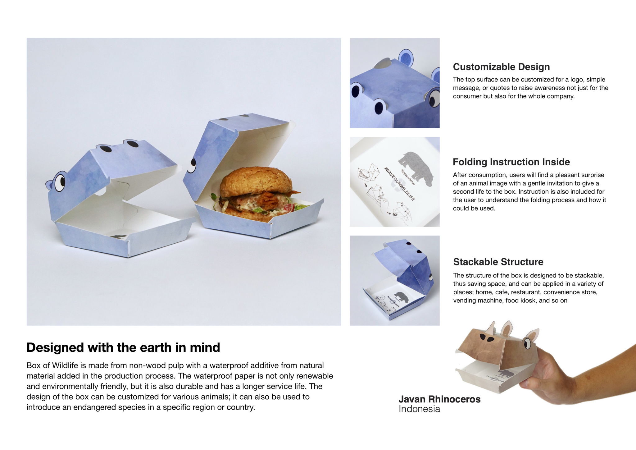 This packaging box is made from non-wood pulp with a waterproof additive from natural material added in the production process. The waterproof paper is not only renewable and environmentally friendly, but it is also durable and has a longer service life. The design of the box can be customized for various animals; it can also be used to introduce an endangered species in a specific region or country.