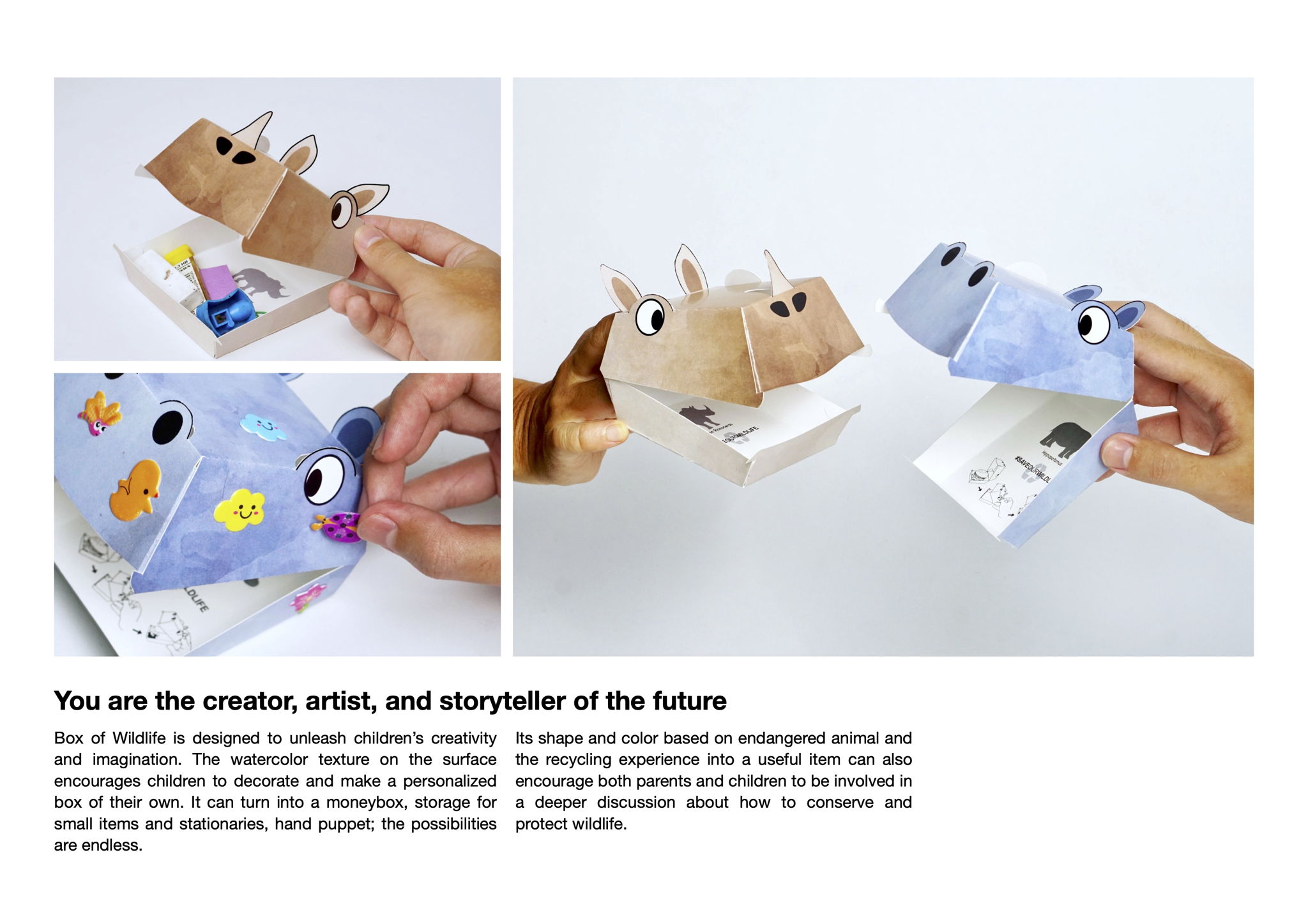 Box of Wildlife is a packaging design that provides an experience for children to learn the recycling process in a way that enhances its value through a fun activity of modifying packaging boxes into functional storage. With the design based on endangered species, it can raise awareness and build a connection between the recycling process and its effect on people, nature, and wildlife.