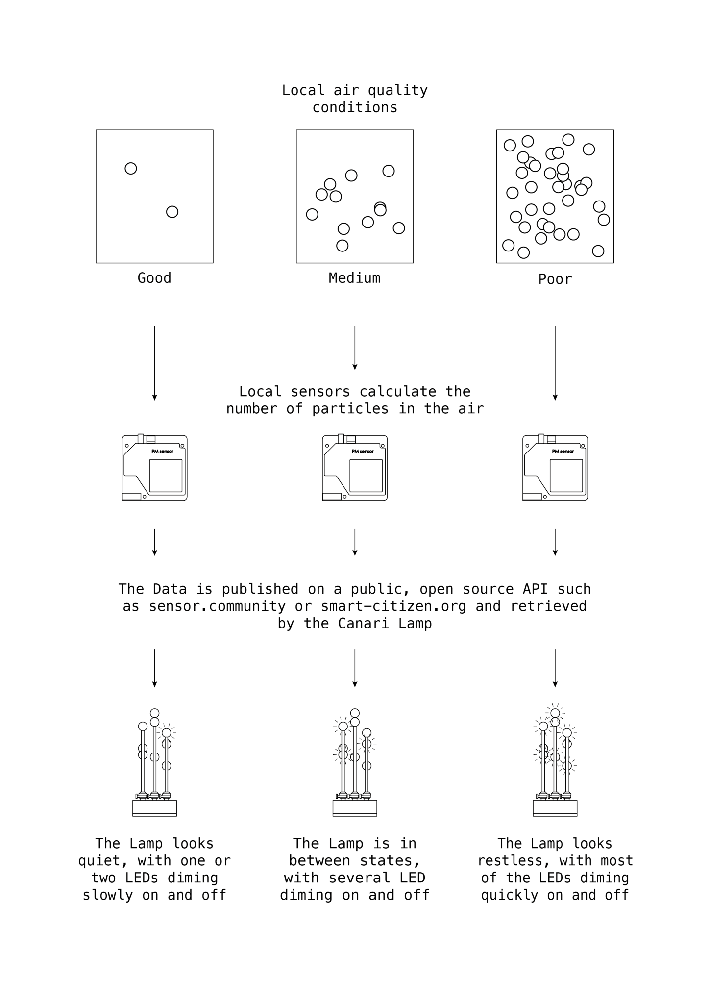 Canari makes air pollution visible, by making the reading of data related to pollution instinctive through the light patterns that a lamp displays, their speed, and their amplitude. The objective is not only to give information to the citizens but rather to sound the alarm and alert them to the need to act at that moment, at that place.