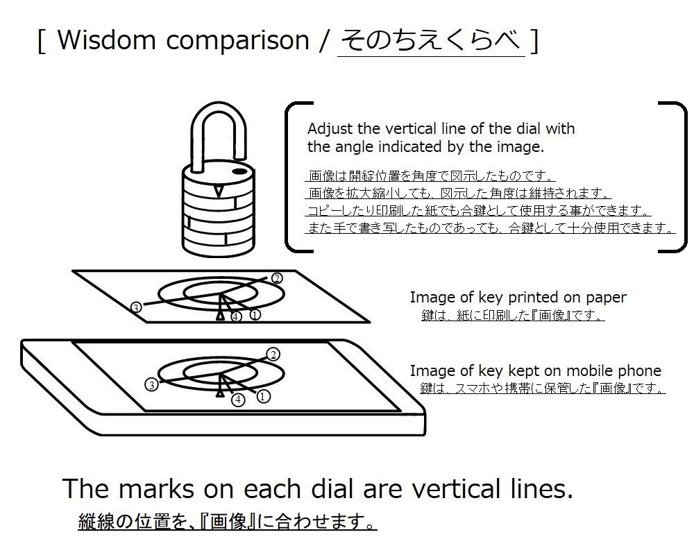 ダイヤル錠を開ける鍵は、写真や図形などの”画像”です。開錠位置を図形で示した紙や画像の電子データでも鍵として使用できます。
