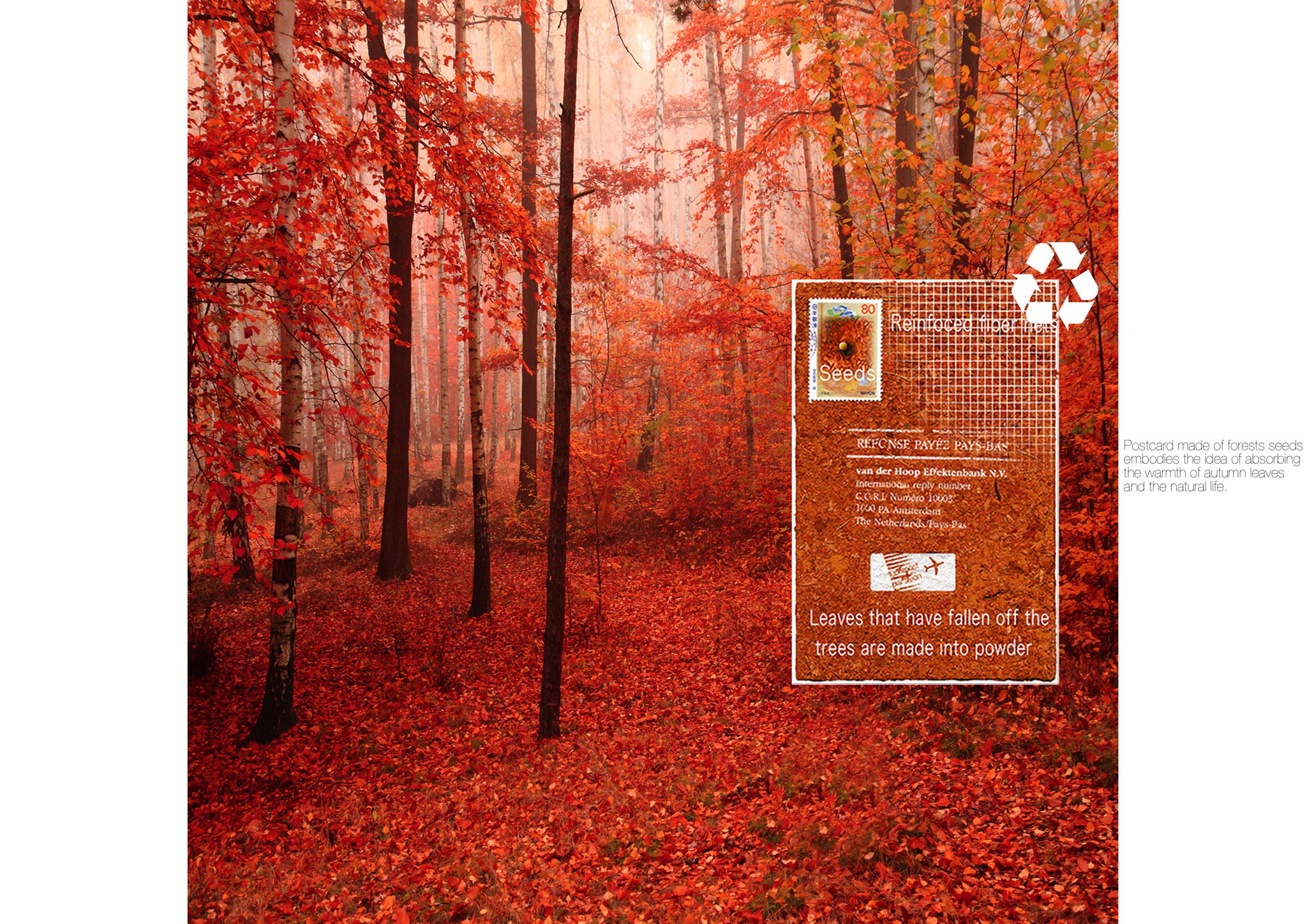 The postcard made of forests seeds embodies the idea of absorbing the warmth of autumn leaves and the natural life.
