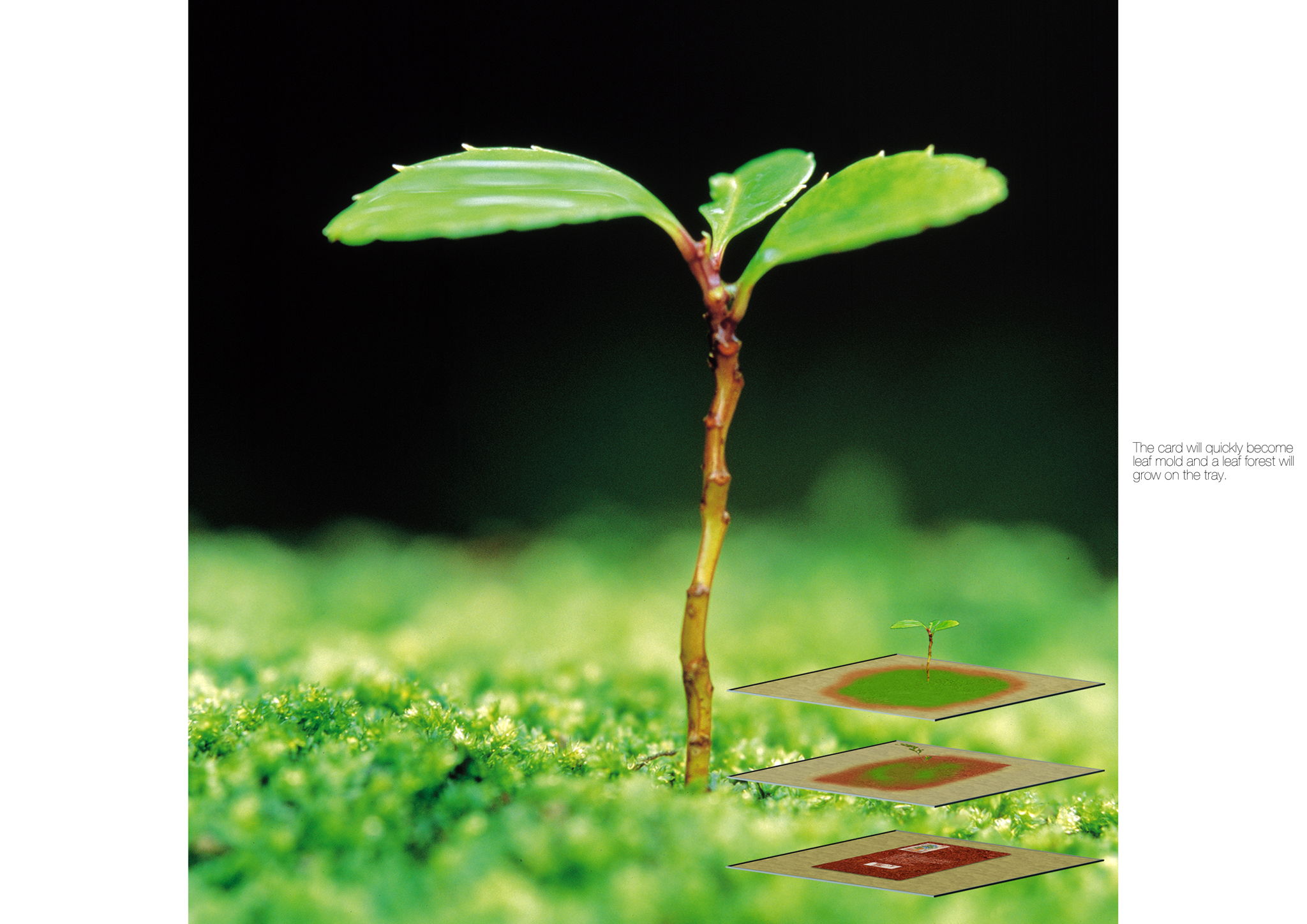 When the autumn leaves dye the mountains red and yellow, transforming the mountains into a soft fluffy carpet, the trees dream of glorious new green lives and deposit their seeds in cradle of the forest. A thin layer of seeds is created, drawing warmth from the fallen leaves, which is then transformed into a postcard and can be sent to friends around the world. Simply lay it on earth, water it and watch a new-born forest emerge. Cradle of the forest reminds us that we need to preserve and protect our natural environment and wants to encourage people to take better care of it. There are seeds under the stamps. Water your card, and your seed will sprout. This plant dissolves when the cards are watered, and helps the seeds to sprout. Put the postcard on the tray that is spread out on. The card will quickly become leaf mold and a leaf forest will grow on the tray.