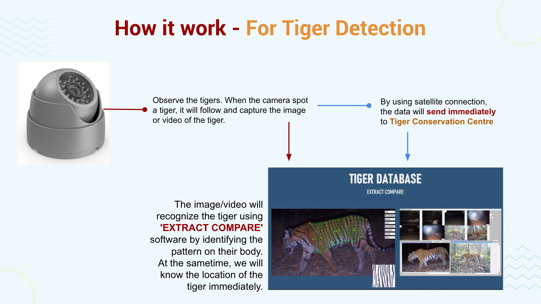 This CCTV can help the patrol team in the forest to detect any illegal activities including to detect the tiger's movement. Besides that, this CCTV also can gather information related to the hunters and report to the nearest authorities. With this device, it is easier for the patrol team to catch the hunters. Other than that, they can protect the tiger and the villagers that lived nearby from being harmed by the tiger.