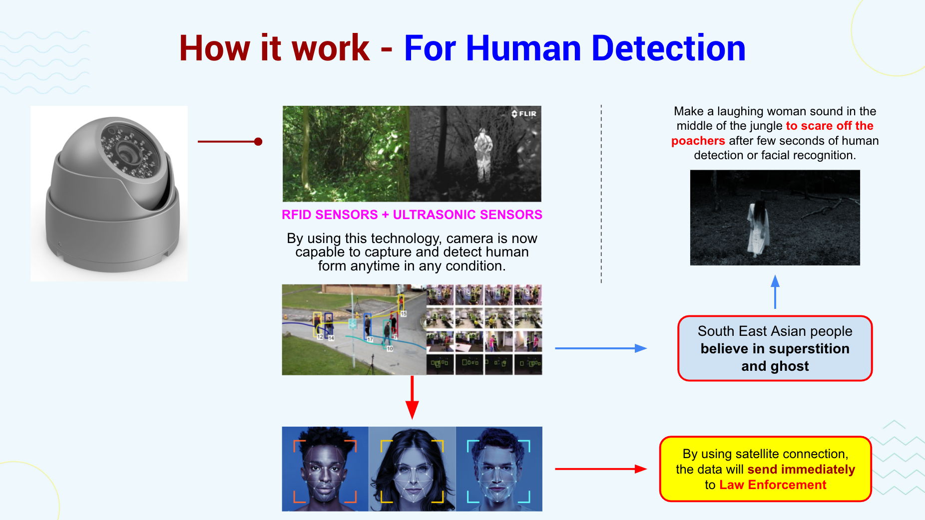 Basically, the functions are the same with the CCTV that we can found everywhere. Not so different but our CCTV are created specially for uses in the forest and more advance. Our CCTV have RFID sensors including ultrasonic sensors. By using this technology, the camera is now capable to capture and detect the hunters easily in the forest. Besides that, all the data that have been captured will be send directly to the Law Enforcement .At the same time, it also can produce a soft woman laughing sound to scare the hunters away.